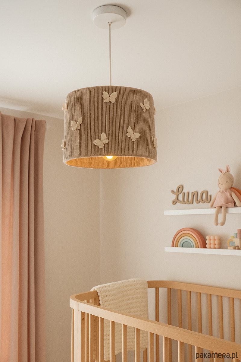 Klosz handmade w beżowe motylki dzięki uniwersalnym kolorom sprawdzi się do wielu dziecięcych sypialni.