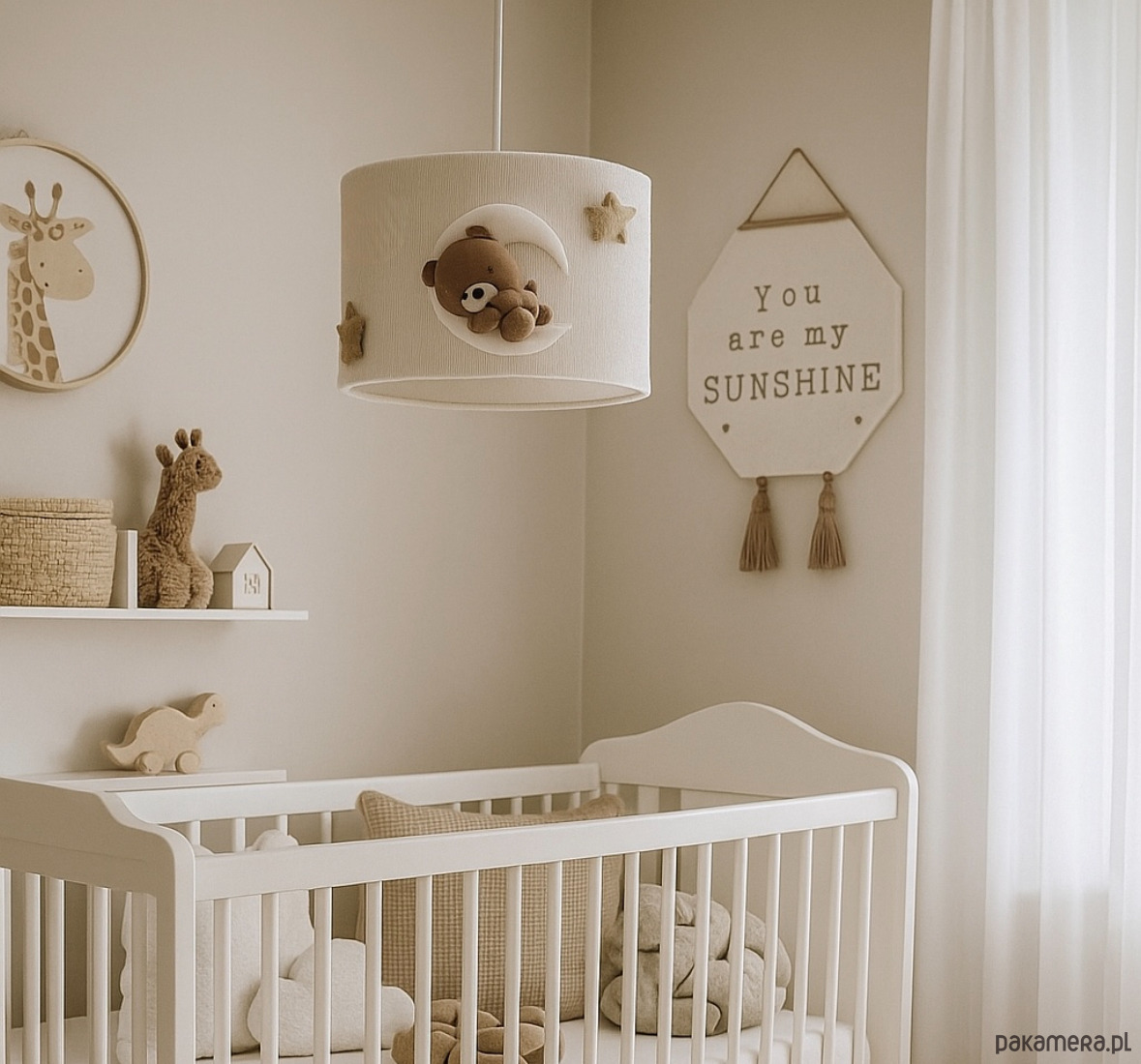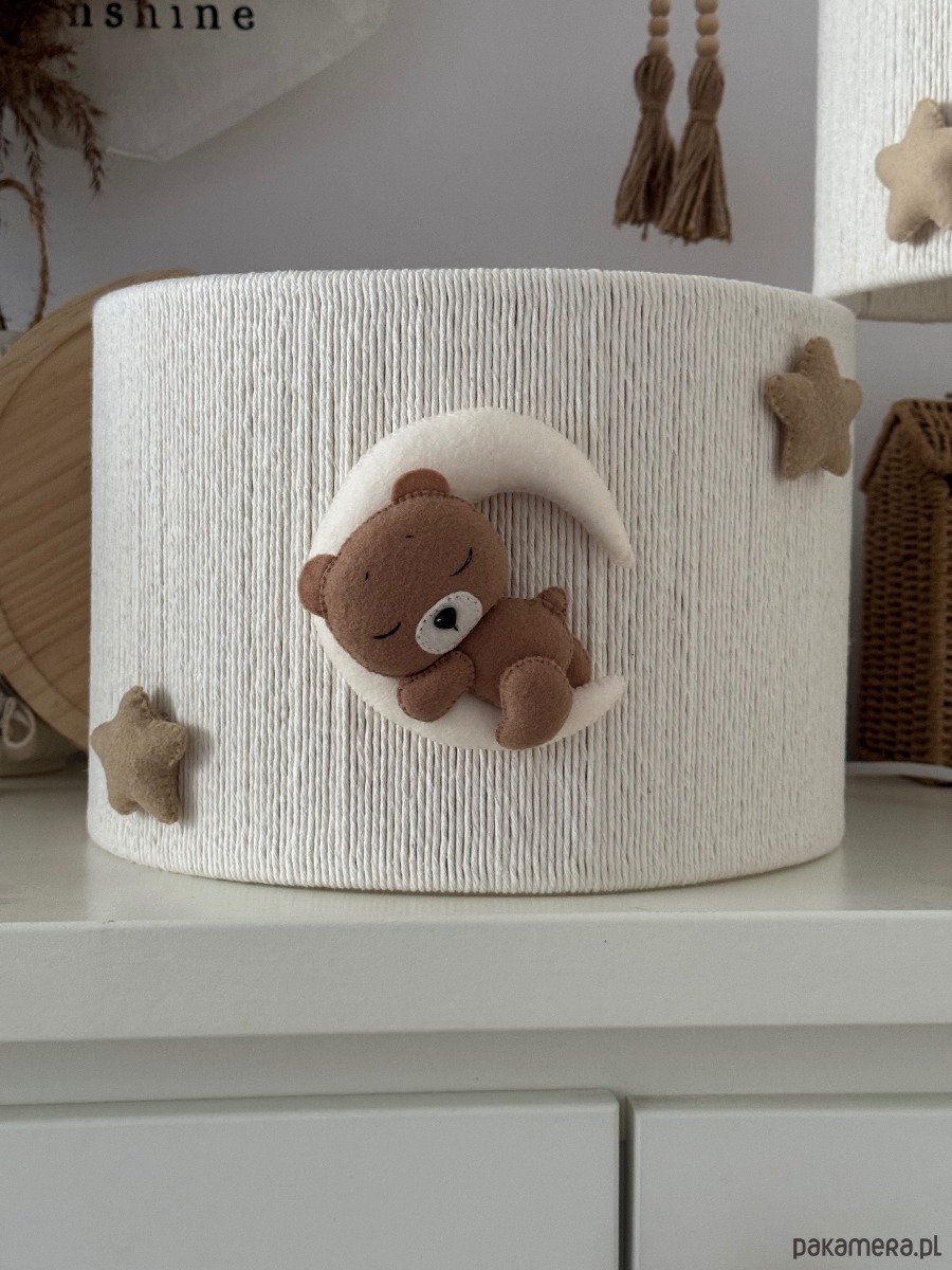 Wyjątkowy klosz do pokoju dziecka w neutralnych kolorach. Na kloszu znajdują się dwa misie i 4 gwiazdki wykonane z wysokiej jakości filcu.