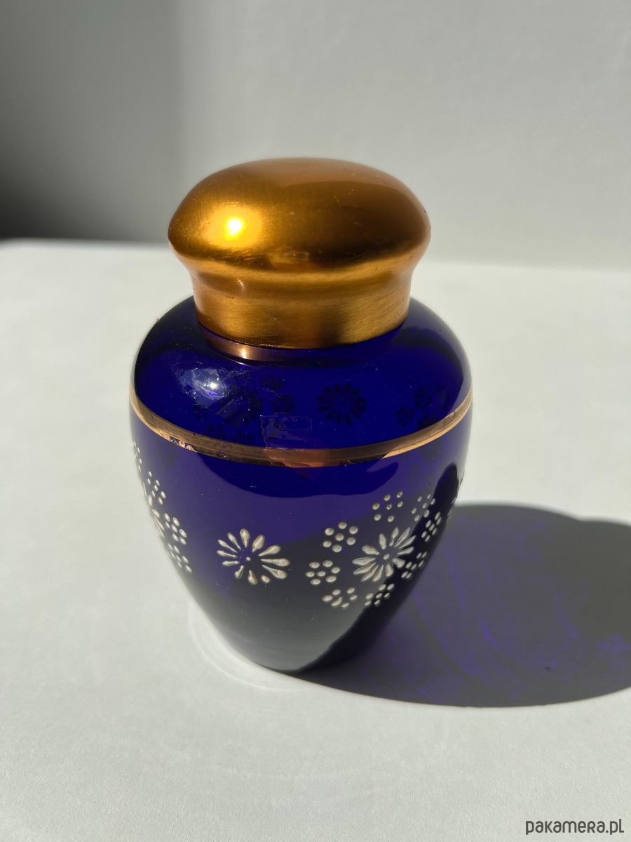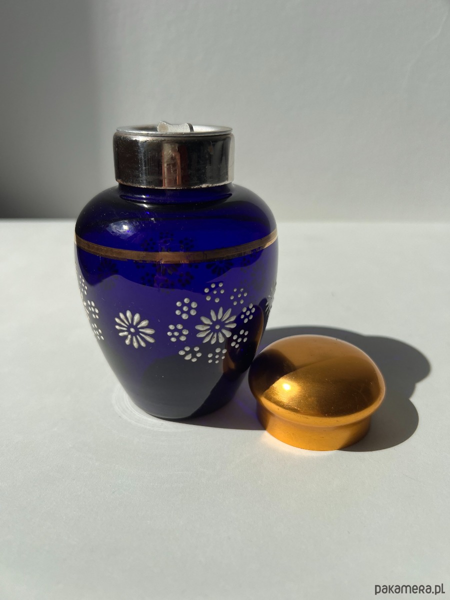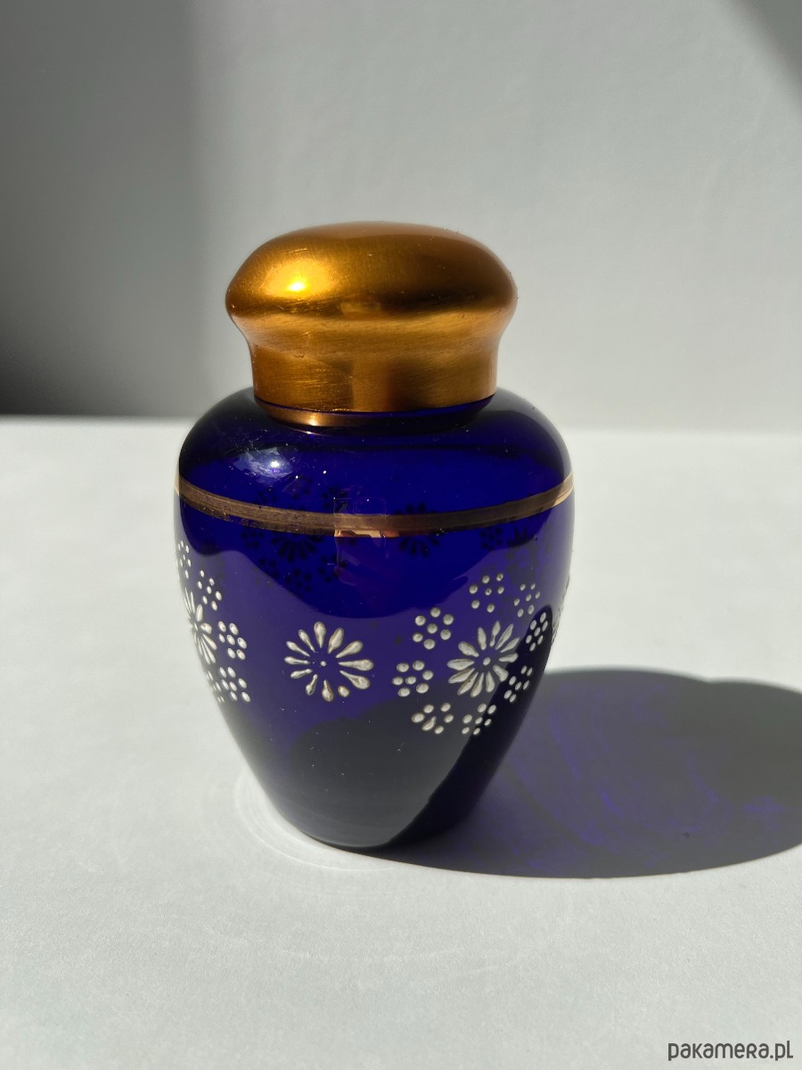 Niewielka butelka ze szkła w kolorze kobaltowym, z aluminiowym korkiem pomalowanym złotą farbką. Ręcznie malowane, drobne kwiatki. Butelka nie otwiera się- może być dekoracją.