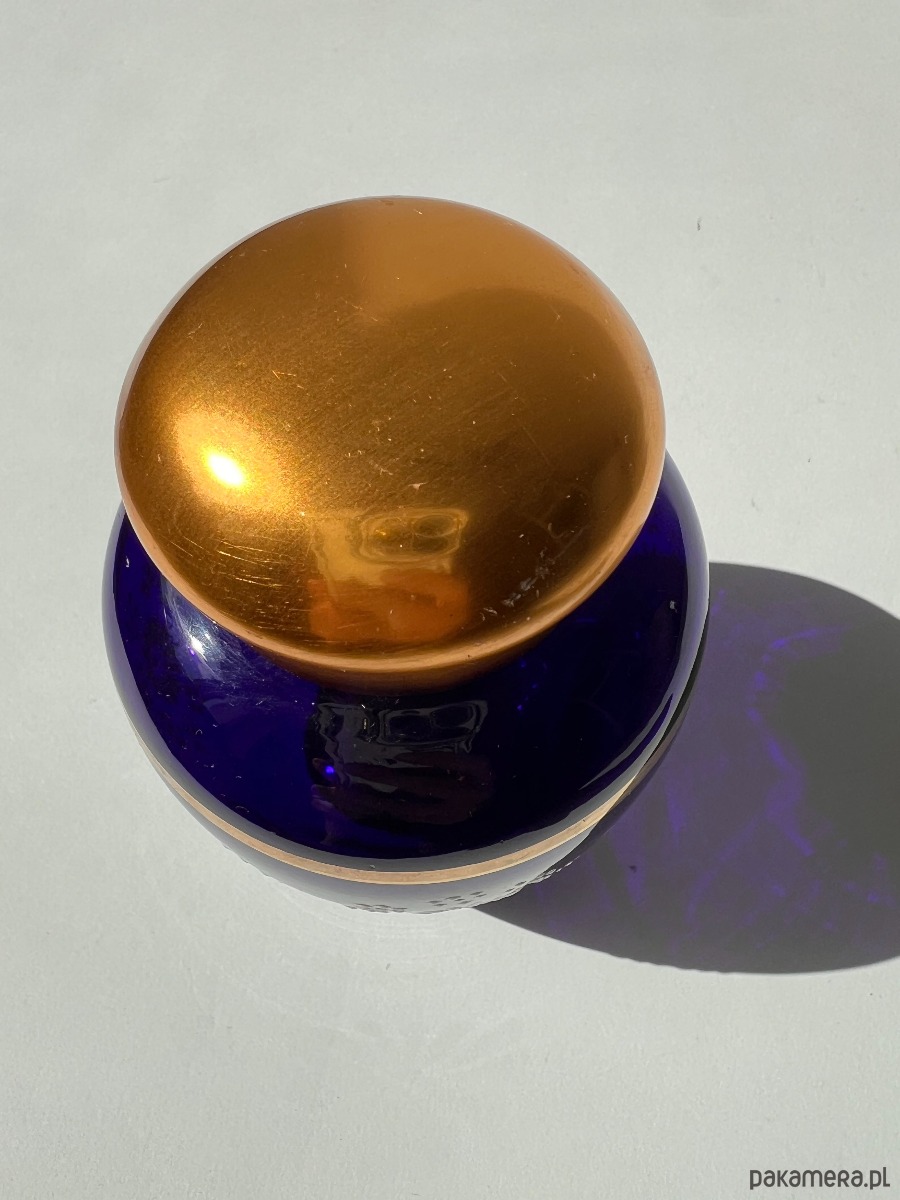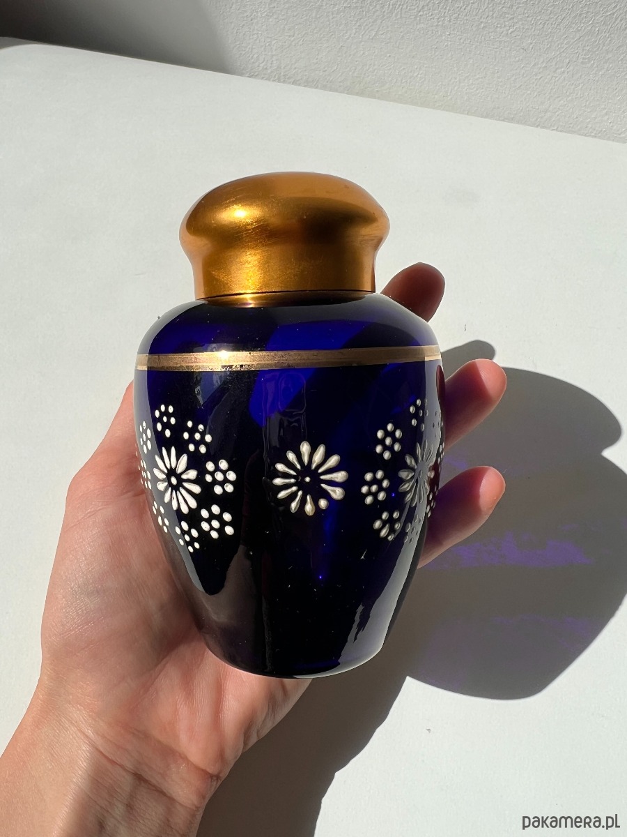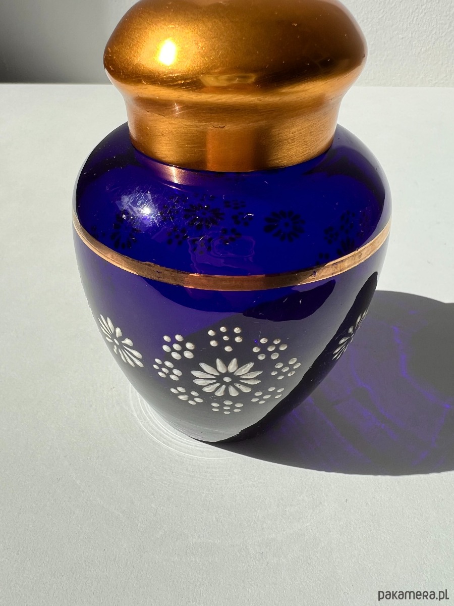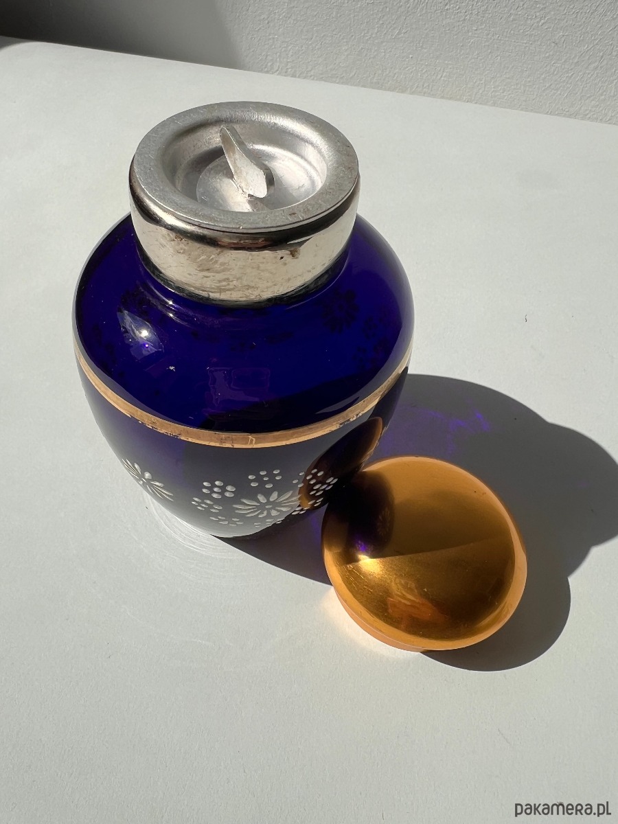 Niewielka butelka ze szkła w kolorze kobaltowym, z aluminiowym korkiem pomalowanym złotą farbką. Ręcznie malowane, drobne kwiatki. Butelka nie otwiera się- może być dekoracją.