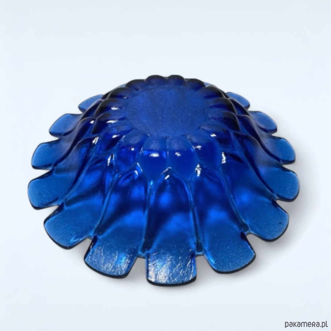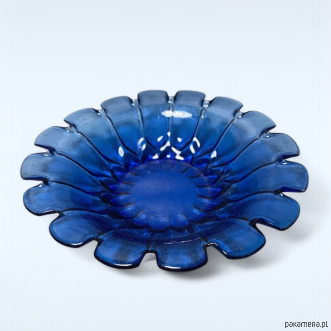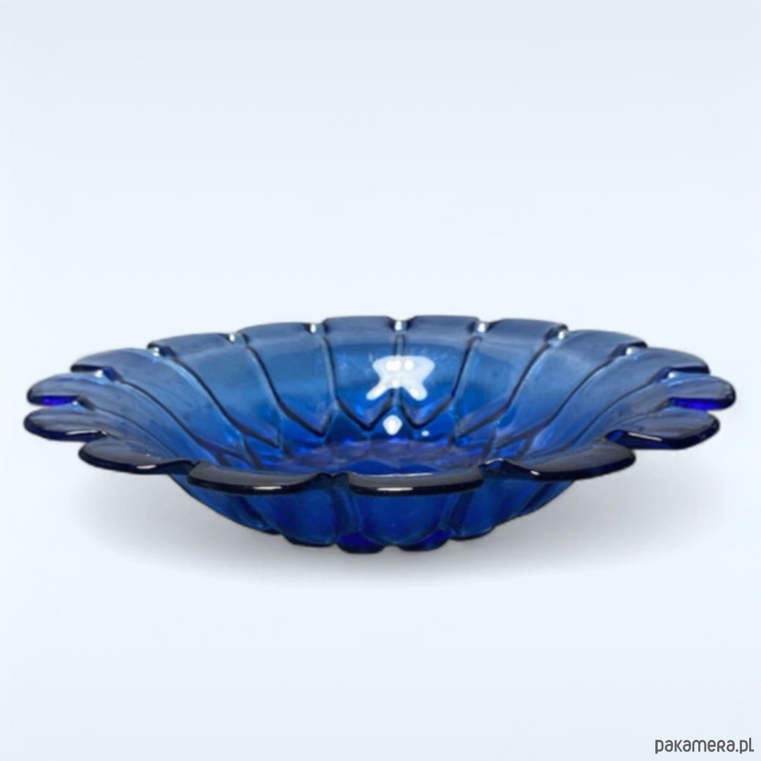 Szklana kobaltowa misa patera. Pochodzi z huty szkła Ząbkowice. Stan bardzo dobry, bez ubytków.