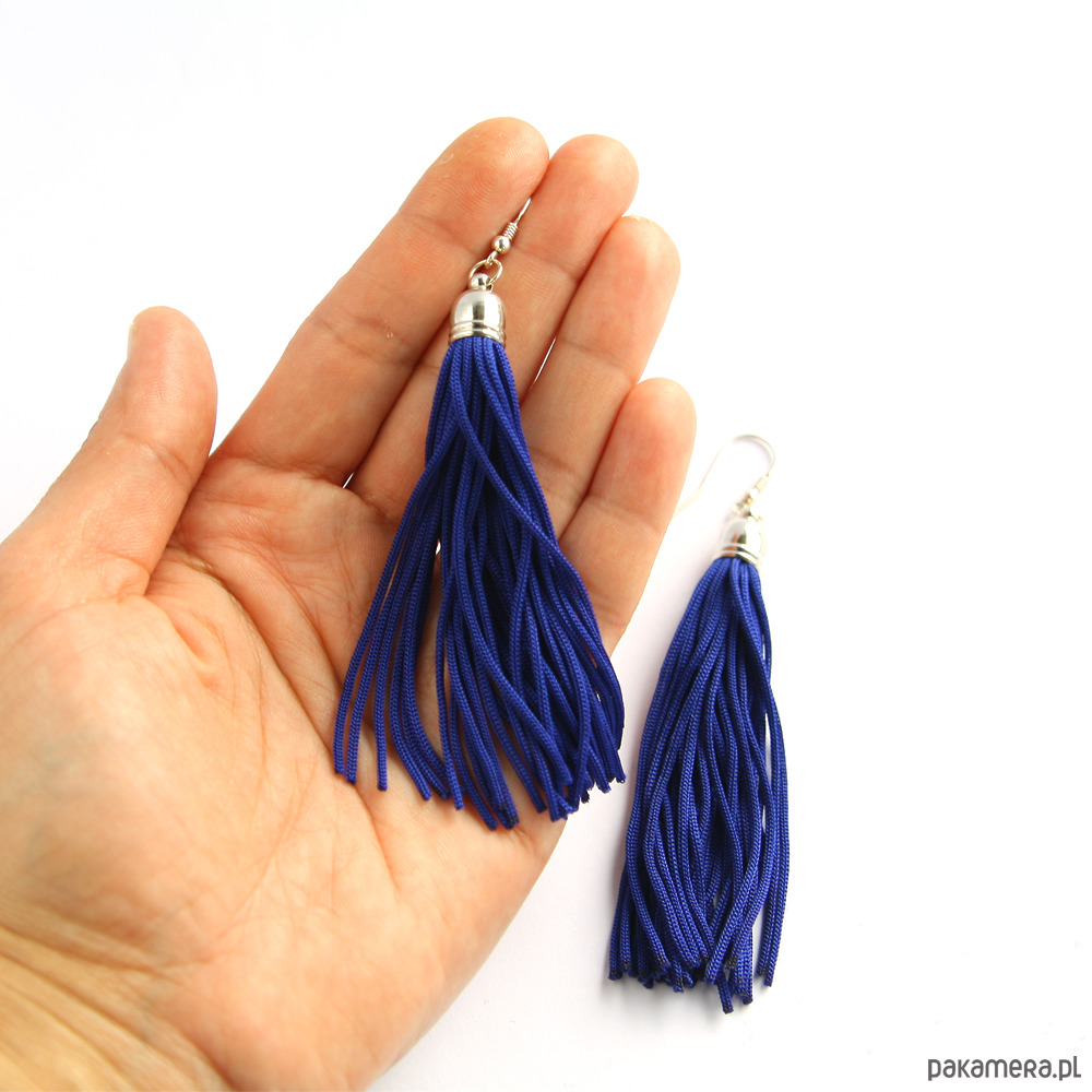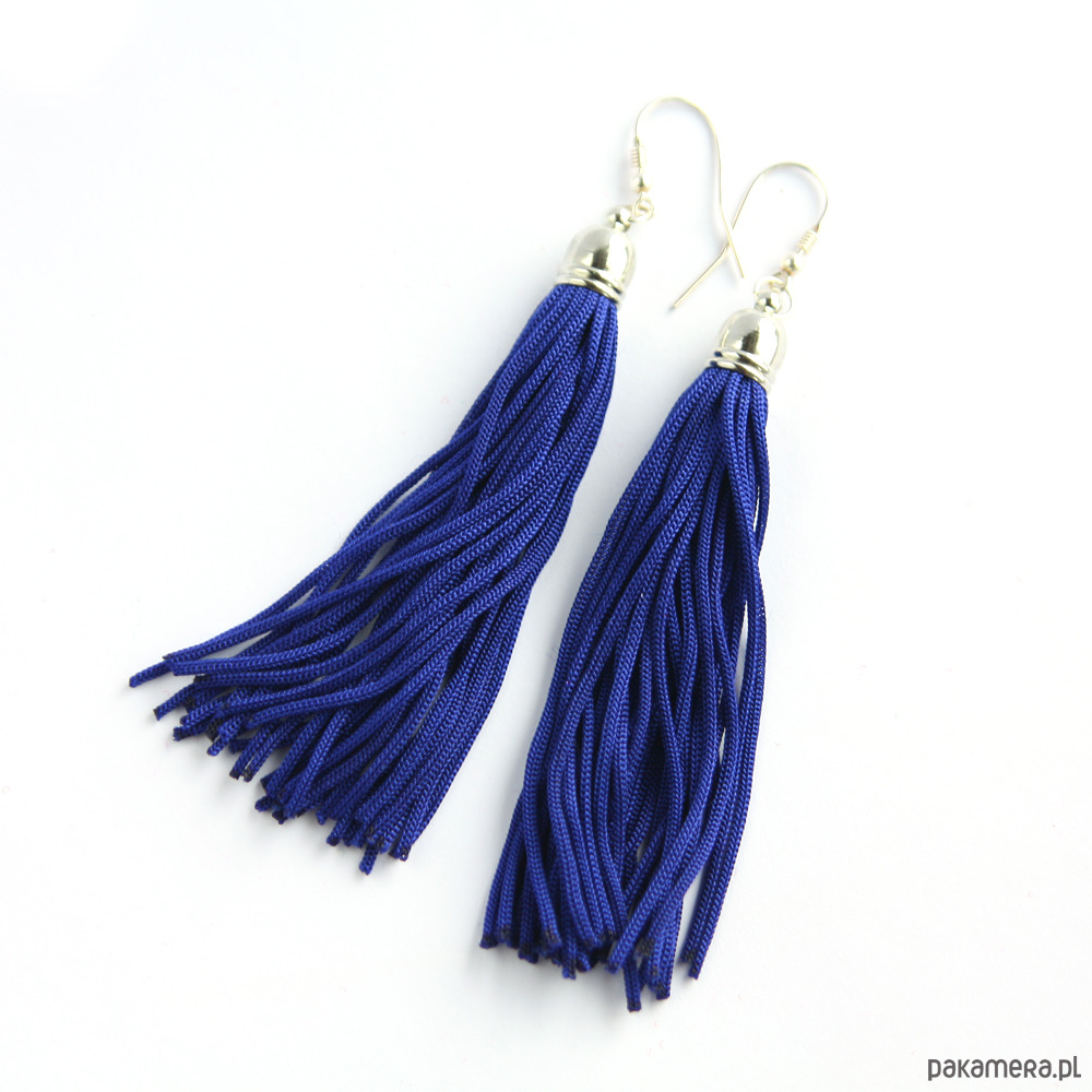 Efektowne kolczyki z długimi chwostami w chabrowym odcieniu granatu - idealne do karnawałowej lub letniej stylizacji!