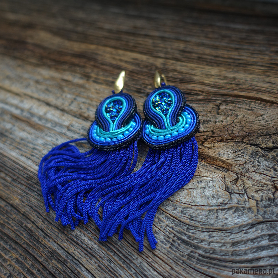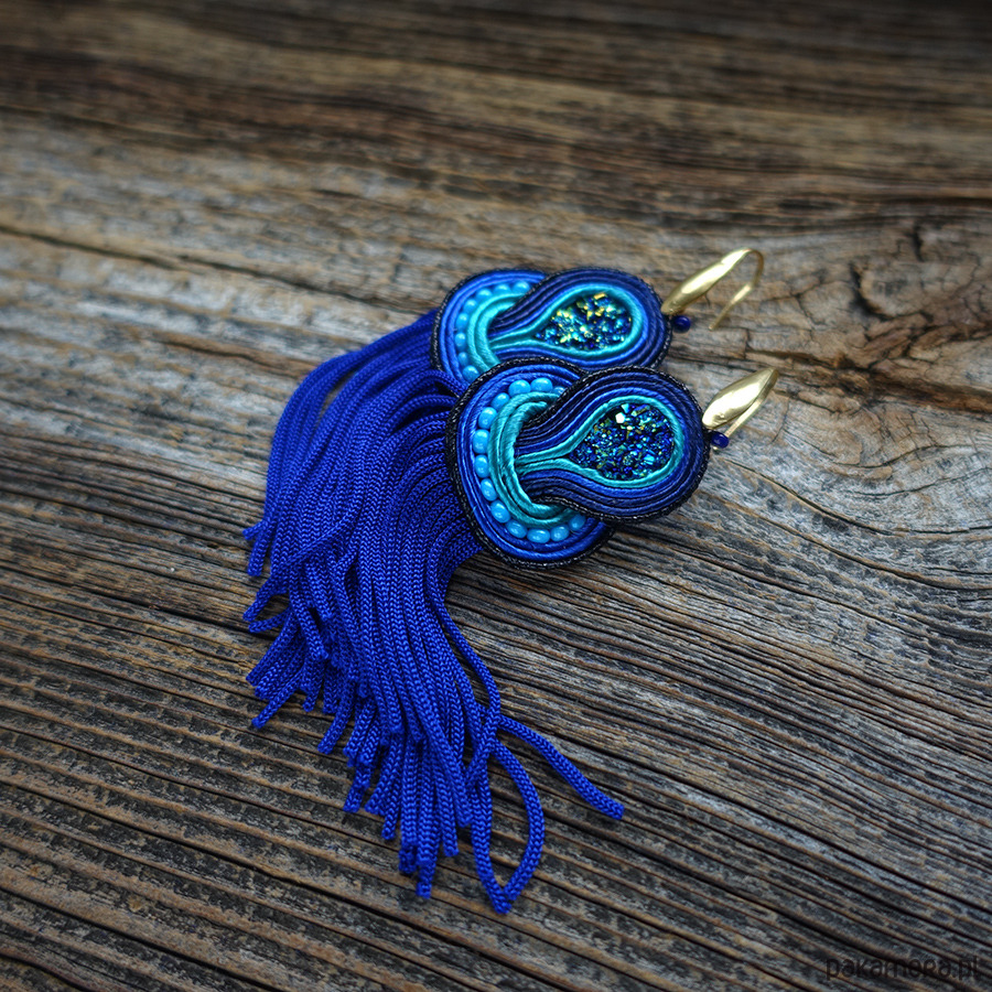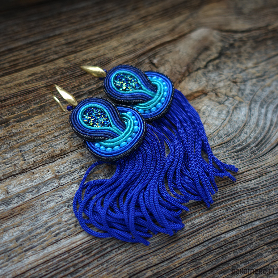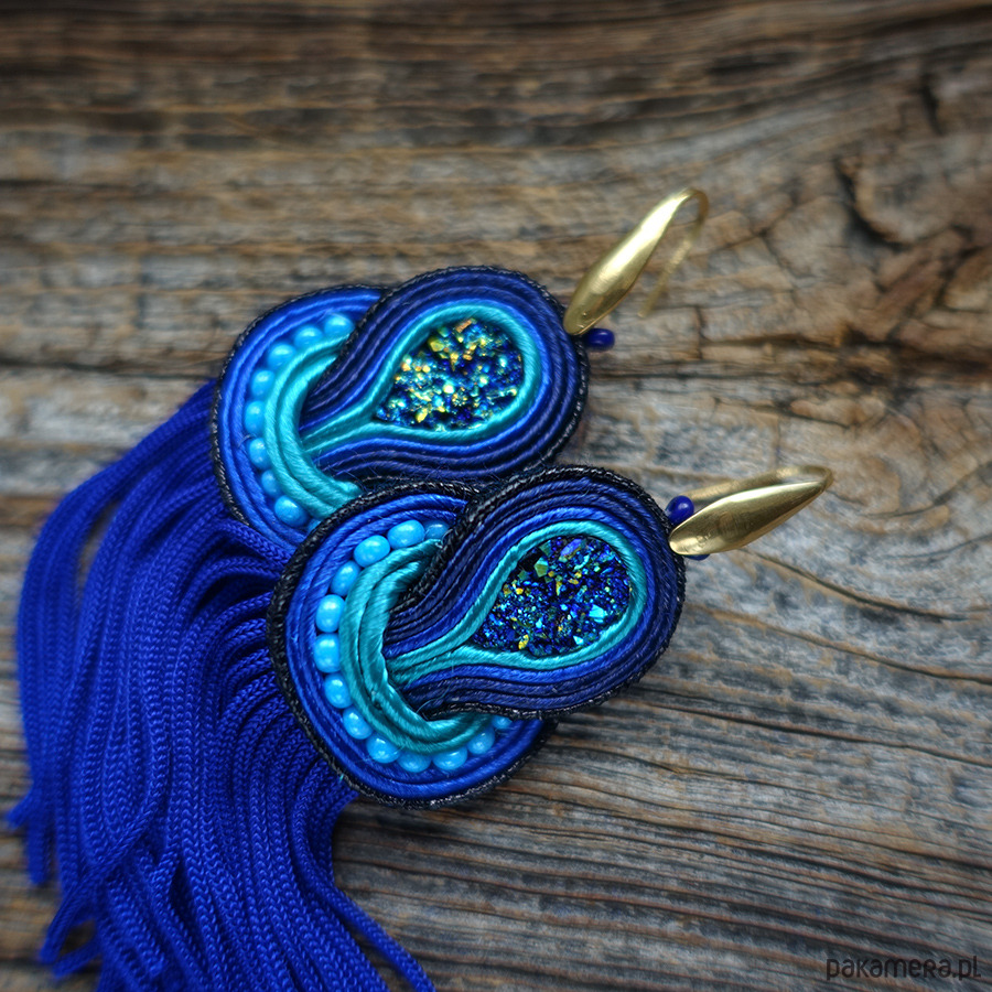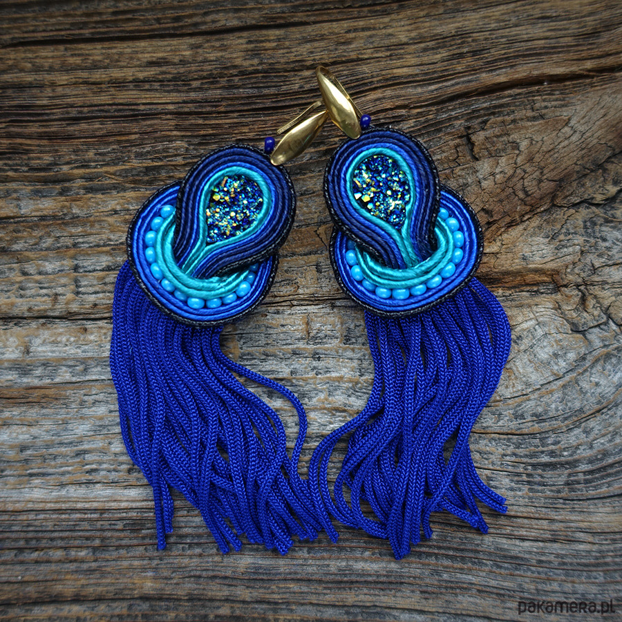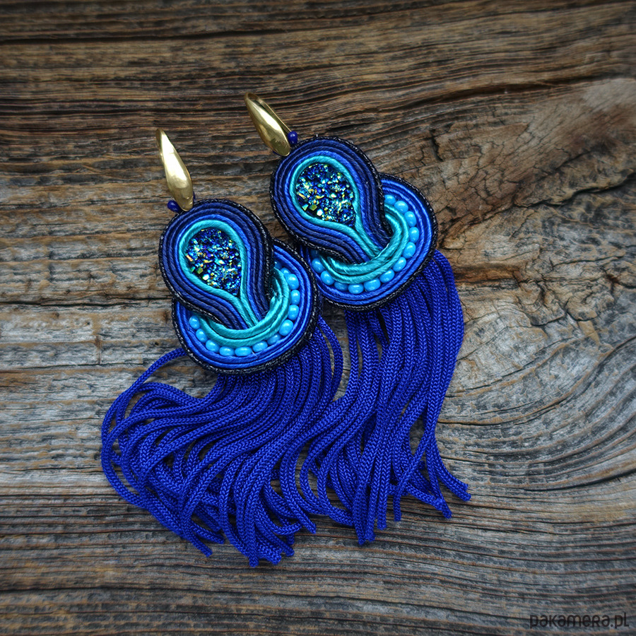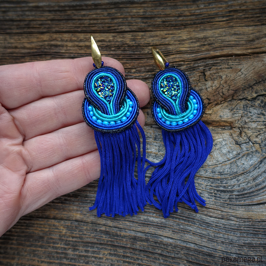 Ręcznie wykonane kolczyki metodą haftu soutache to wyraziste, dynamiczne dodatki dla kobiet, które kochają unikalne ozdoby. Intensywne odcienie granatu i turkusu połączone zostały z błyszczącymi kaboszonami druzy 💎, koralikami Preciosa oraz lekkimi, wiskozowymi chwostami 💃, które dodają im swobody i ekspresji.