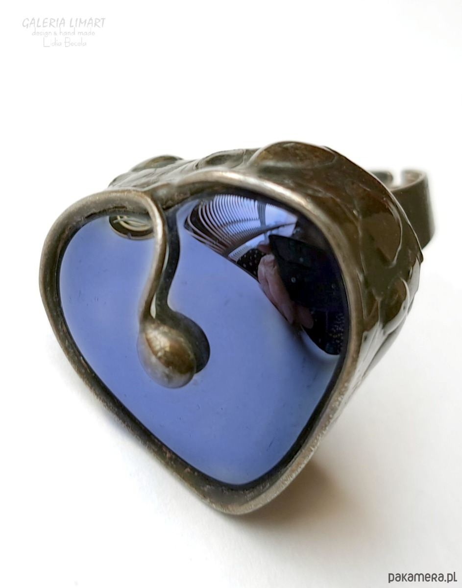 Pierścionek z ręcznie przetopionego szkła witrażowego (fusing) w kształcie ślicznego serca w niezwykłym kobaltowym kolorze, znacznie efektowniejszym w rzeczywistości niż na zdjęciu.