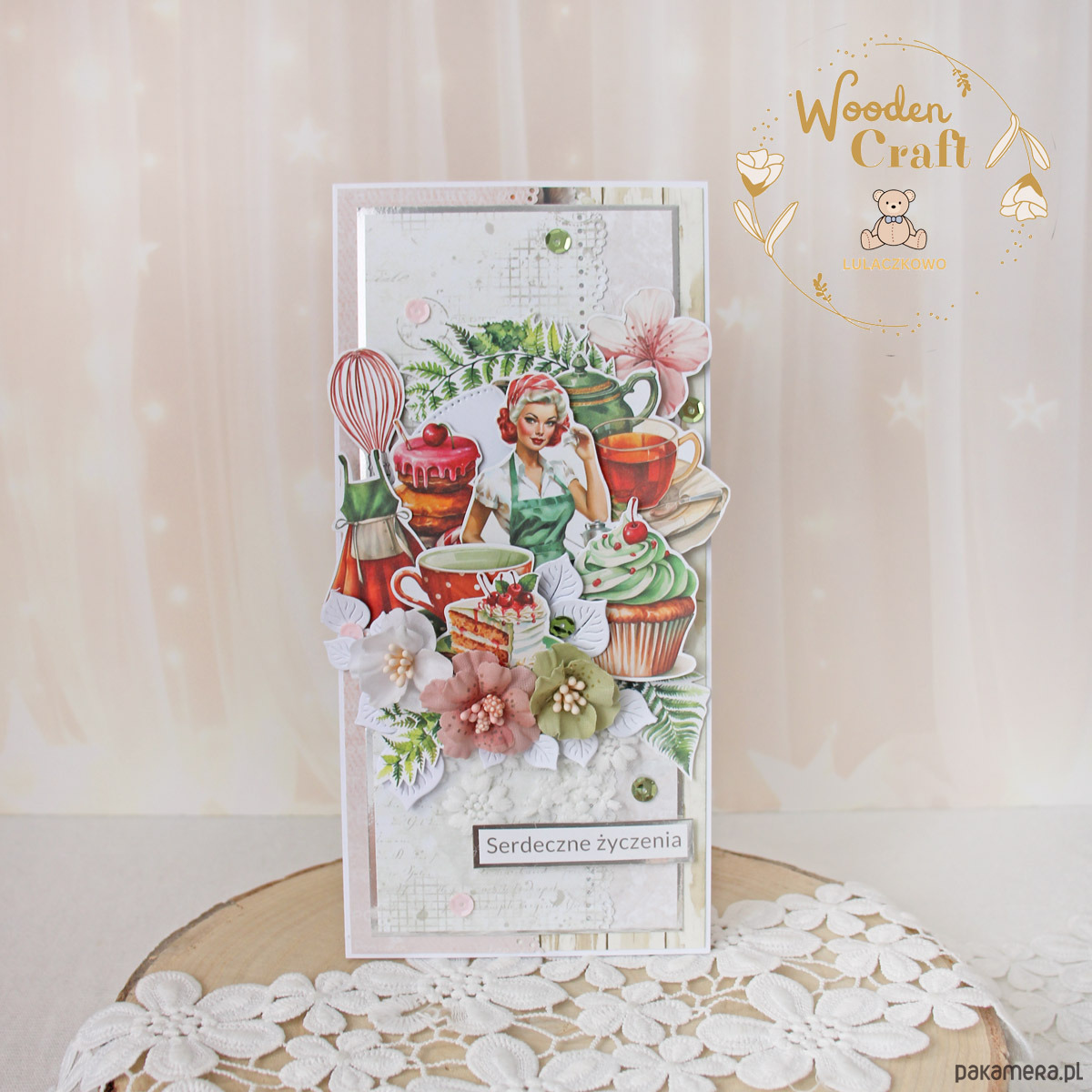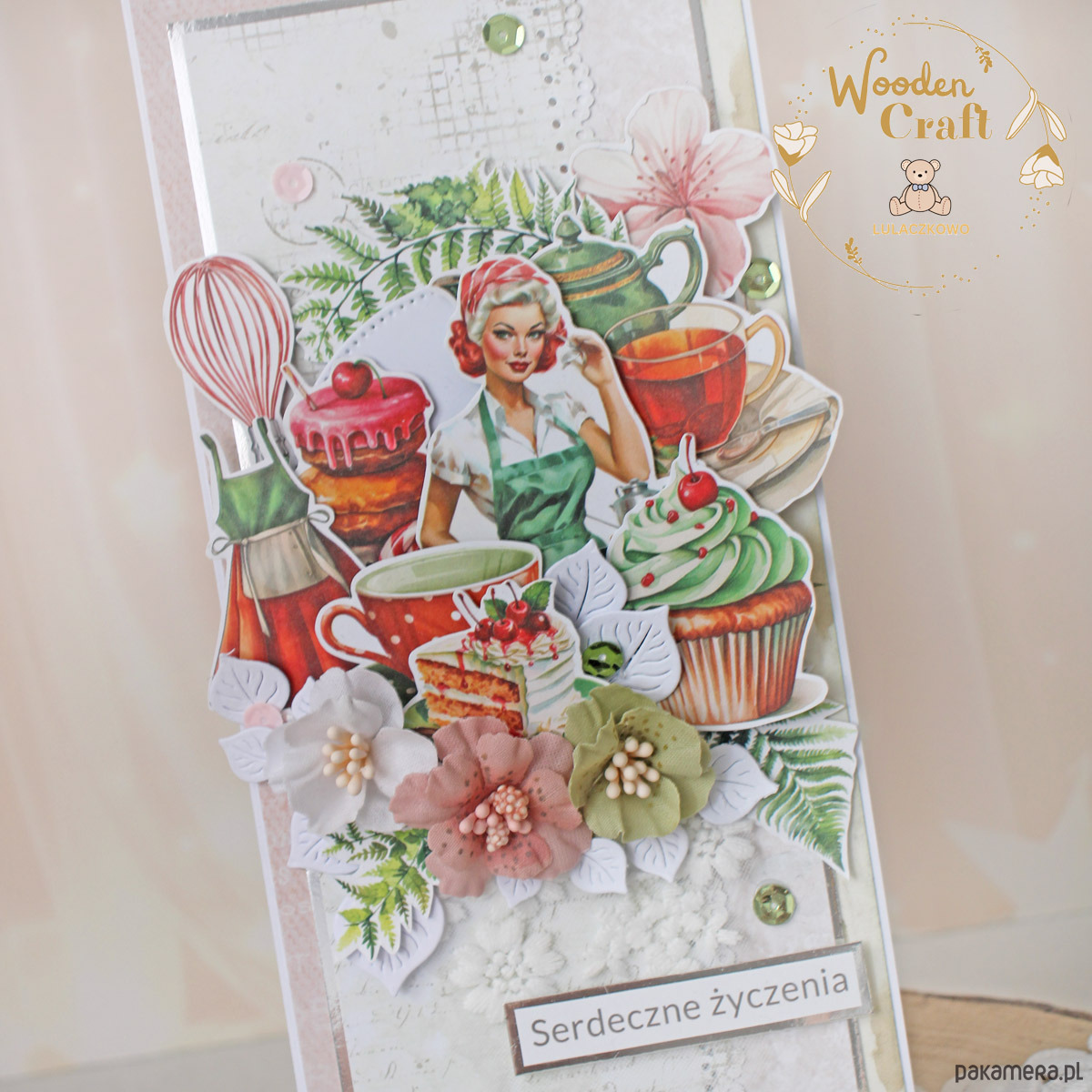 Rewelacyjna, nietuzinkowa kartka urodzinowa dla kobiety, utrzymana w odcieniach beżu, bladego różu i bieli, z dodatkiem srebrnych błyszczących akcentów, z motywem kuchennym. Bogato zdobiona licznymi grafikami związanymi z kuchnią, udekorowana ręcznie robionymi, materiałowymi kwiatami, a także połyskującymi cekinami oraz napisem "Serdeczne Życzenia".