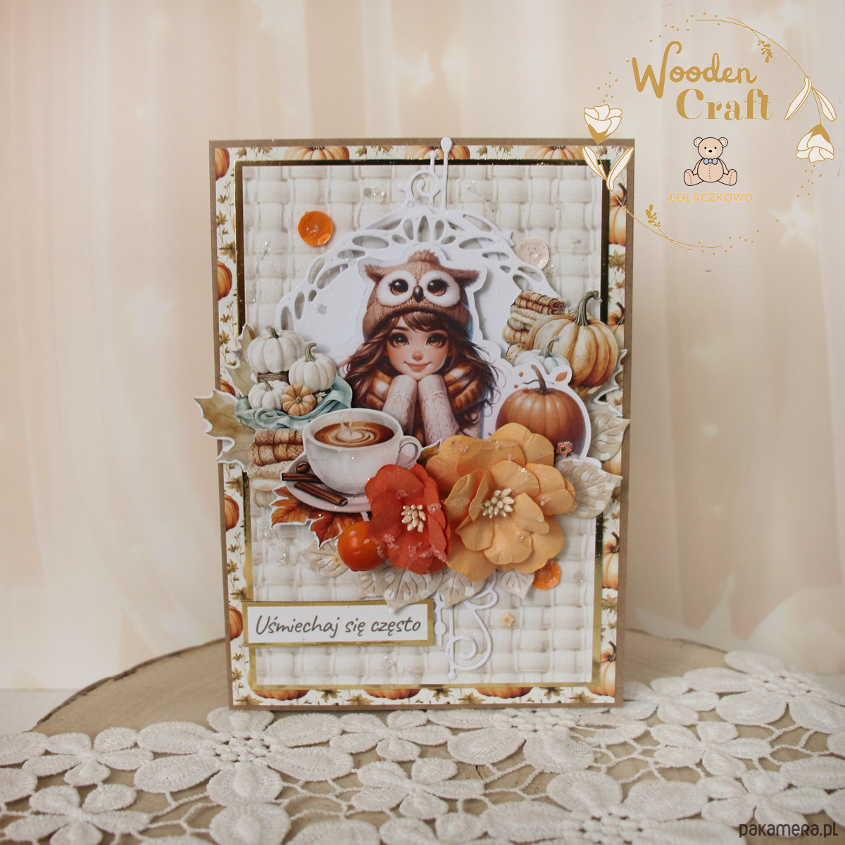 Piękna i nietuzinkowa, bogato zdobiona kartka urodzinowa dla kobiety - z motywem jesiennym. Utrzymana w odcieniach beżu, brązu, bieli i pomarańczu, z dodatkiem złotych błyszczących akcentów, z grafiką pięknej dziewczyny ubranej w ciepły sweterek i czapkę, otoczoną kompozycją z dyń, gorącej herbatki, książek i kocyka, a także papierowych kwiatów. Kartka ozdobiona cekinami, połyskującymi drobinkami oraz napisem "Uśmiechaj się często" (na życzenie napis mogę zmienić na dowolny).