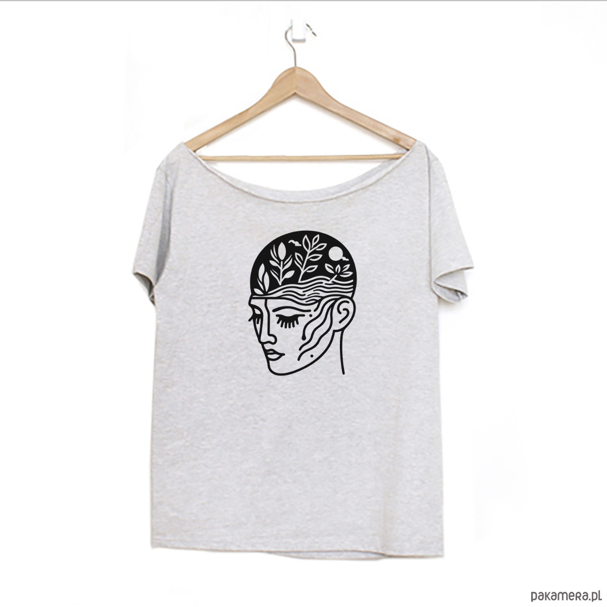 Szary, luźny oversize z czarnym minimalistycznym nadrukiem.