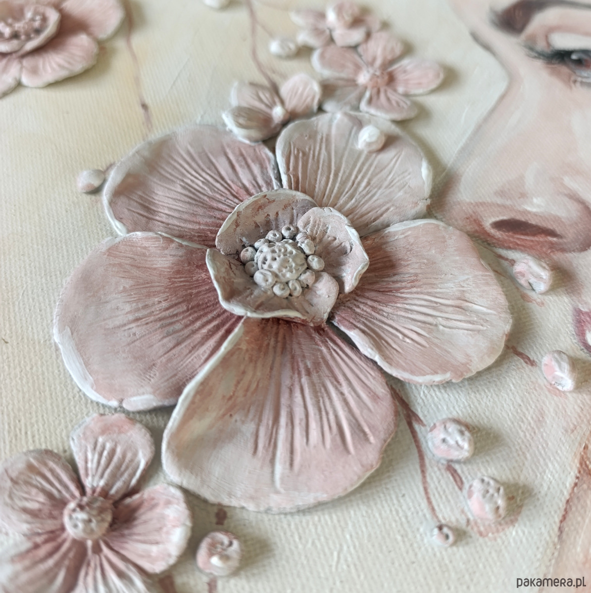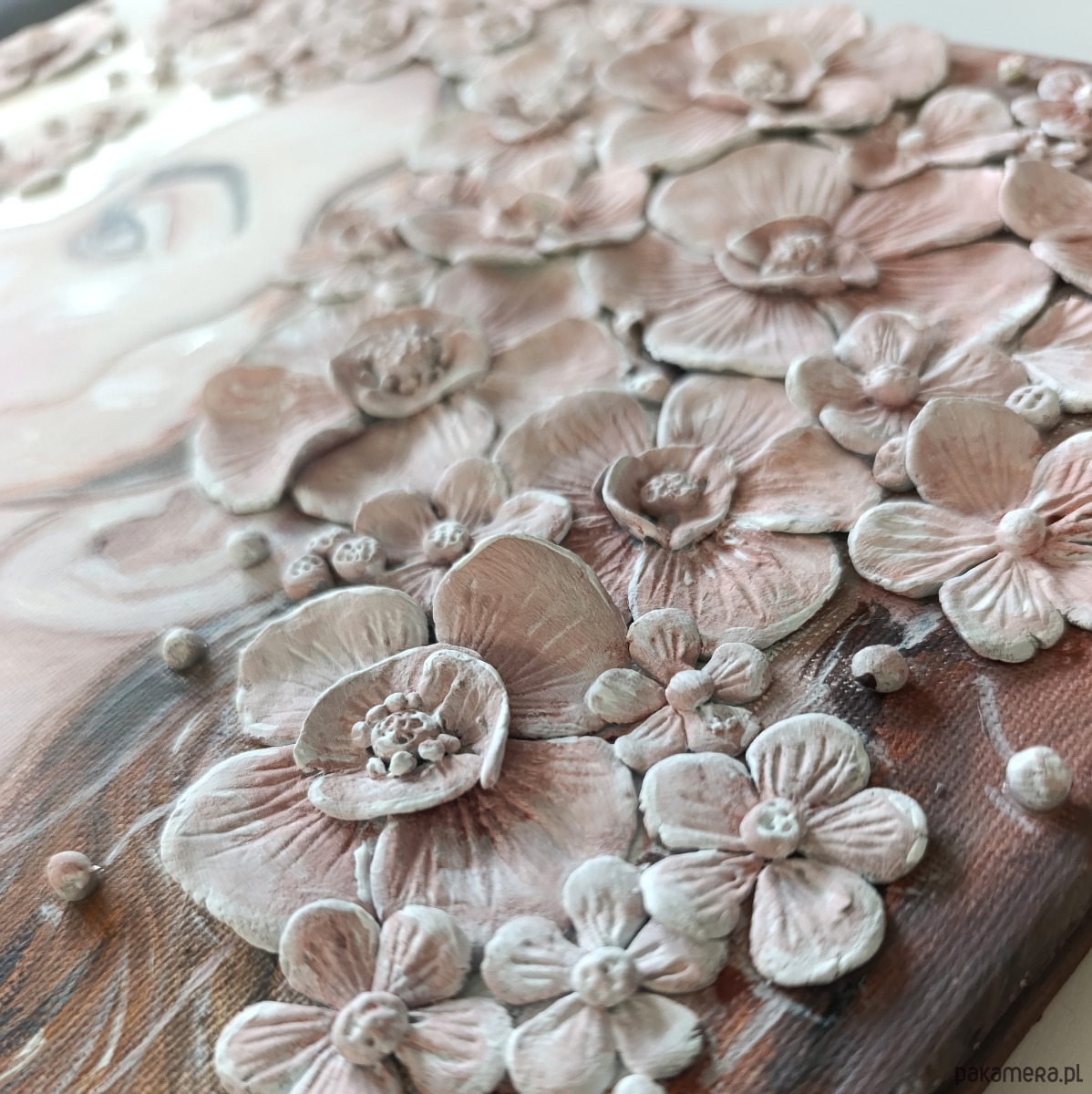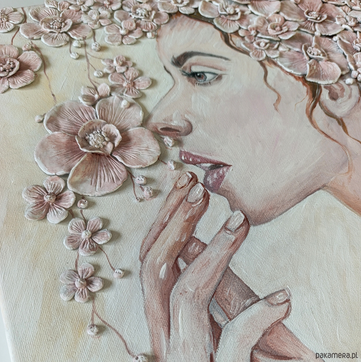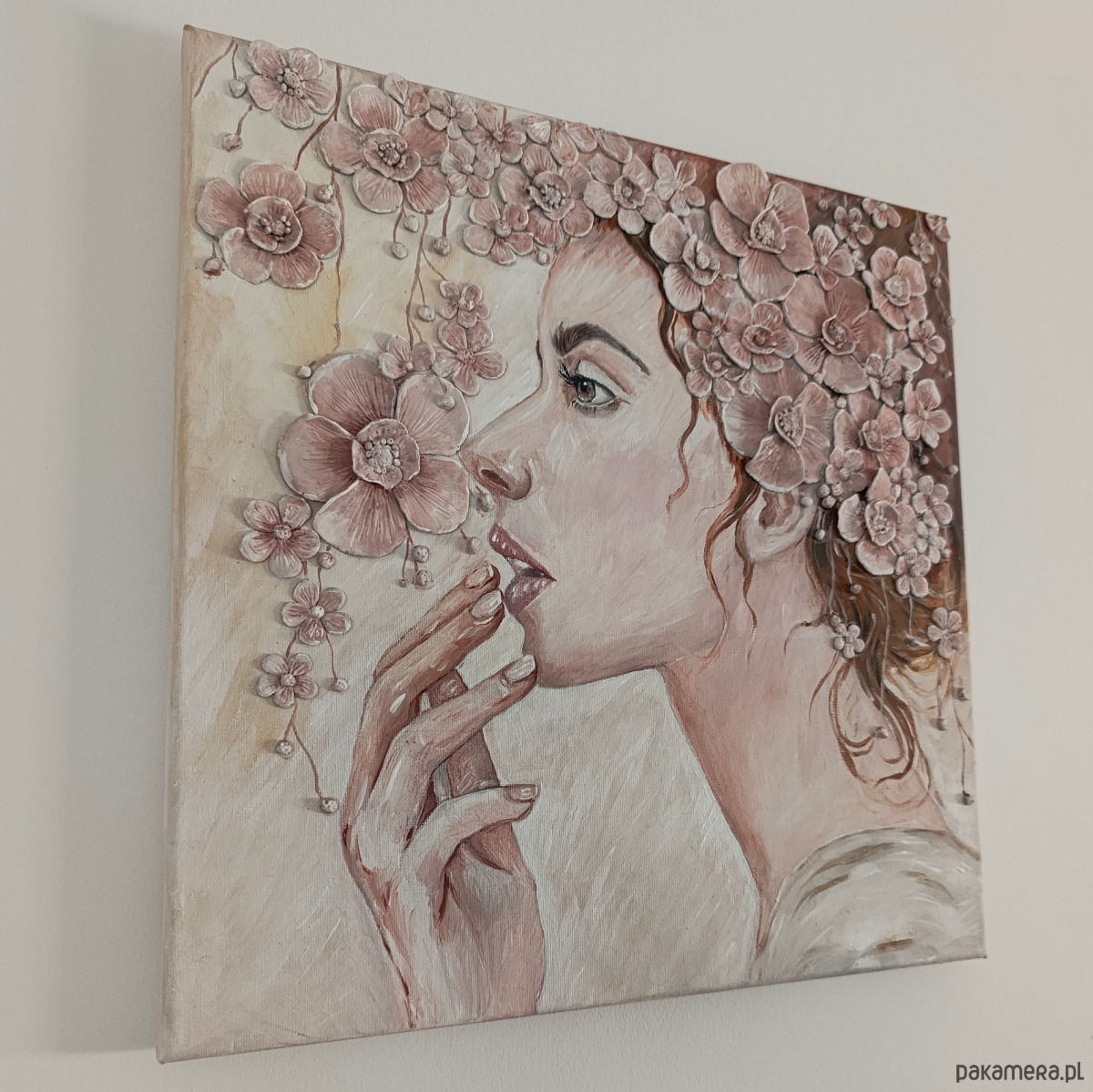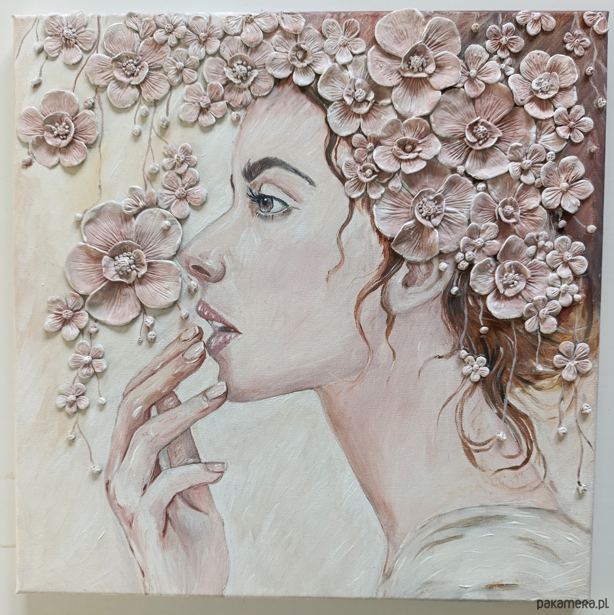 Portret kobiety z profilu, otoczonej kwiatami, wykonany na płótnie naciągniętym na blejtram. Kwiaty zostały stworzone autorską techniką rzeźbienia, dzięki czemu są trójwymiarowe i wyraźnie wyczuwalne pod palcami. To połączenie malarstwa akrylowego i płaskorzeźby w jednym obrazie.