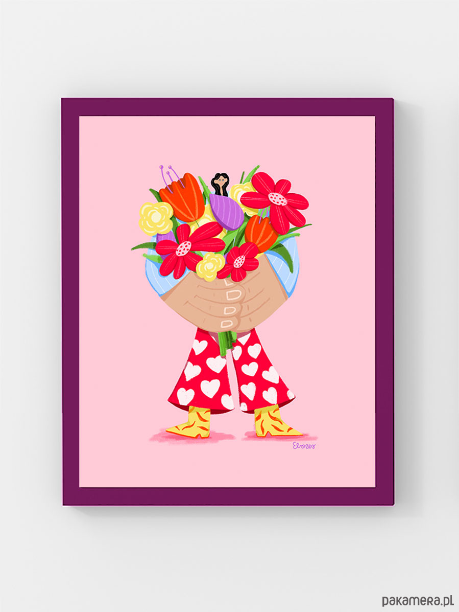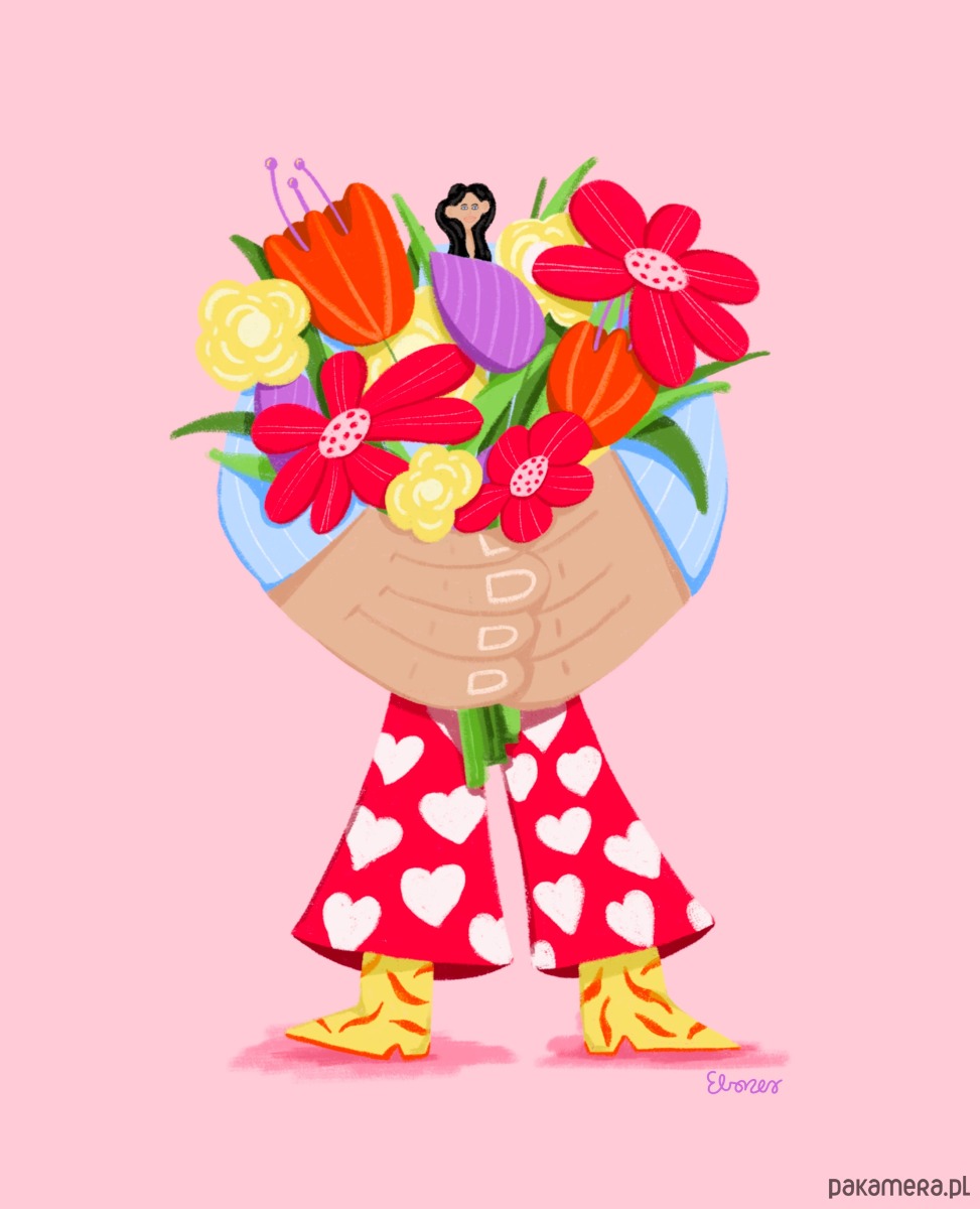Kolorowa ilustracja kobiety niosącej bukiet kwiatów