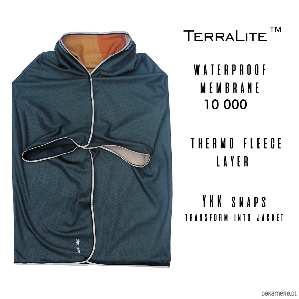 łatwo zmieścisz go w plecaku. Uniwersalny koc na każdą wyprawę Jest praktycznym rozwiązaniem na odpoczynek, zapewniając wygodne miejsce do siedzenia lub leżenia, a jego kompaktowy rozmiar sprawia, że łatwo go zabrać w każdą podróż. TerraLite™ – lekka moc natury TerraLite™ to nowoczesna, trójwarstwowa dzianina softshellowa wyprodukowana w Polsce zaprojektowana z myślą o wymagających warunkach outdoorowych. Łączy oddychalność, wodoodporność i ochronę przed wiatrem w lekkiej, elastycznej formie, która dopasowuje się do każdego ruchu. wewnętrzna warstwa ma miękki, polarowy materiał, który zapewnia ciepło i wygodę, zewnętrzna warstwa, wodoodporna powłoka, chroniącą przed wilgocią i wiatrem (membrana 10000/m2 wodoodporność,oddychalność 3000/m2) Ubierz go na siebie i zapnij dzięki renomowanym napom YKK Połączyliśmy praktyczną funkcję kurtek softshellowych z matami turystycznymi dzięki napom YKK. Złącz napy w odpowiednich miejscach, aby stworzyć funkcjonalną pelerynę, która ochroni przed deszczem i wiatrem. To szybka i wygodna zmiana, idealna na nieprzewidywalną pogodę podczas wypraw. Dodaj energii twojej wyprawie Kolorowy koc turystyczny TripMate z wyjątkowym designem ożywi każdą wędrówkę i podróż.Jego intensywne barwy wyróżniają się na tle przyrody, dodając radości i pozytywnej energii. Urozmaici odpoczynek na szlaku i doda stylu Twoim przygodom. Dodatkowe zalety koca wyprawowego Tripmate: - odblaskowa lamówka – zwiększa widoczność po zmroku - zapinane wodoodporne etui, które ochroni koc przed brudem i piaskiem - nie przylega do niego piasek