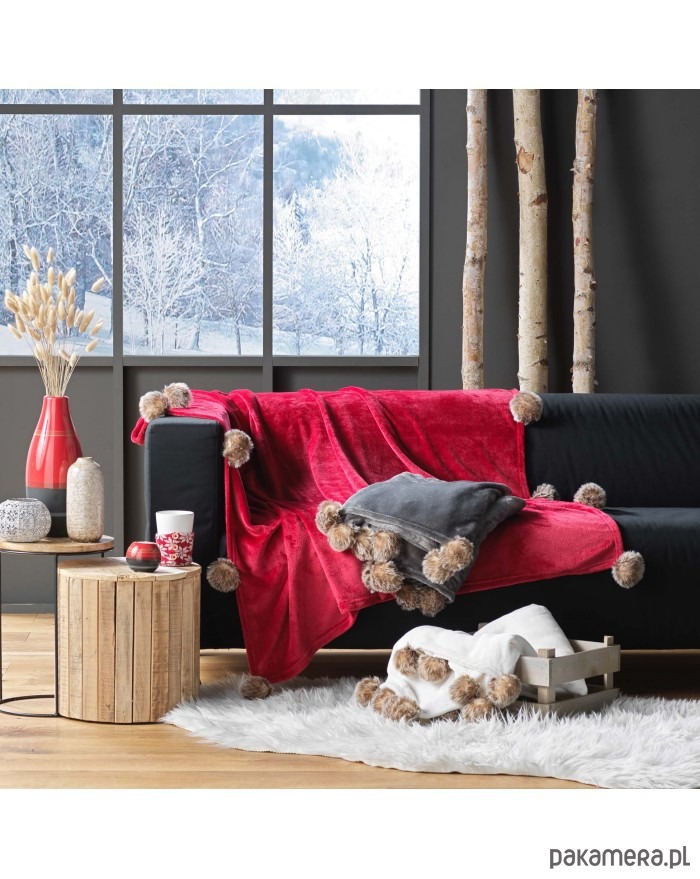 Dla miłośników ciepłych i przytulnych pledów idealny koc z wytrzymałego poliestru. Puchaty i przyjemny w dotyku posiada duże pompony wykonane ze sztucznego futra. Sprawią, że wnętrze nabierze charakteru skandynawskiego domku w górach. Na jesienne i zimowe wieczory nieodzowny zarówno do przykrycia się podczas relaksu na kanapie, jak i do udekorowania łóżka.