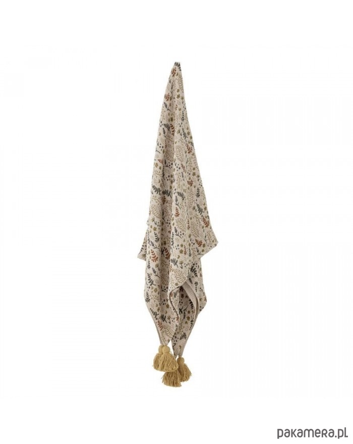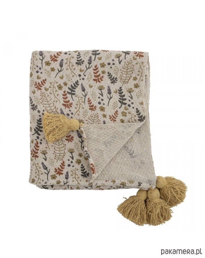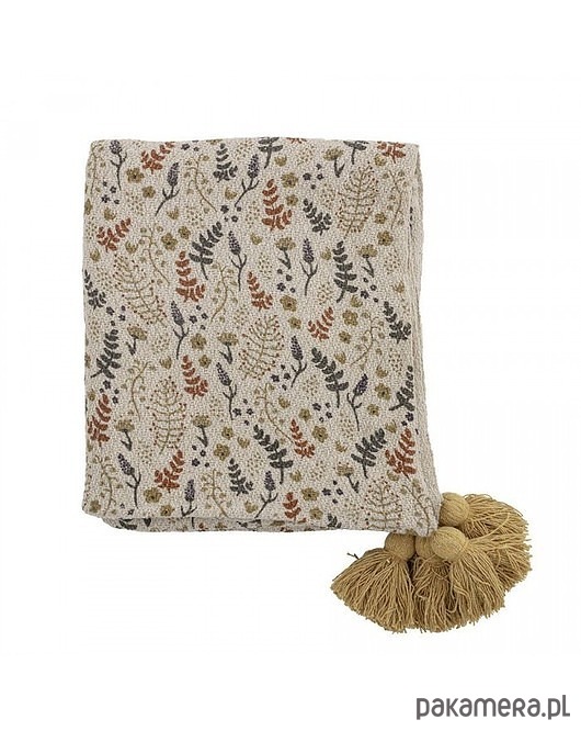 Narzuta, koc dziecięcy został wykonany z bawełny (68%), poliestru (27%) i wiskozy. Roślinny wzór jest po jednej stronie, na rogach znajdują się ozdobne frędzle. Koc jest miękki w dotyku i przytulny. Można go prać w temperaturze 30 stopni.