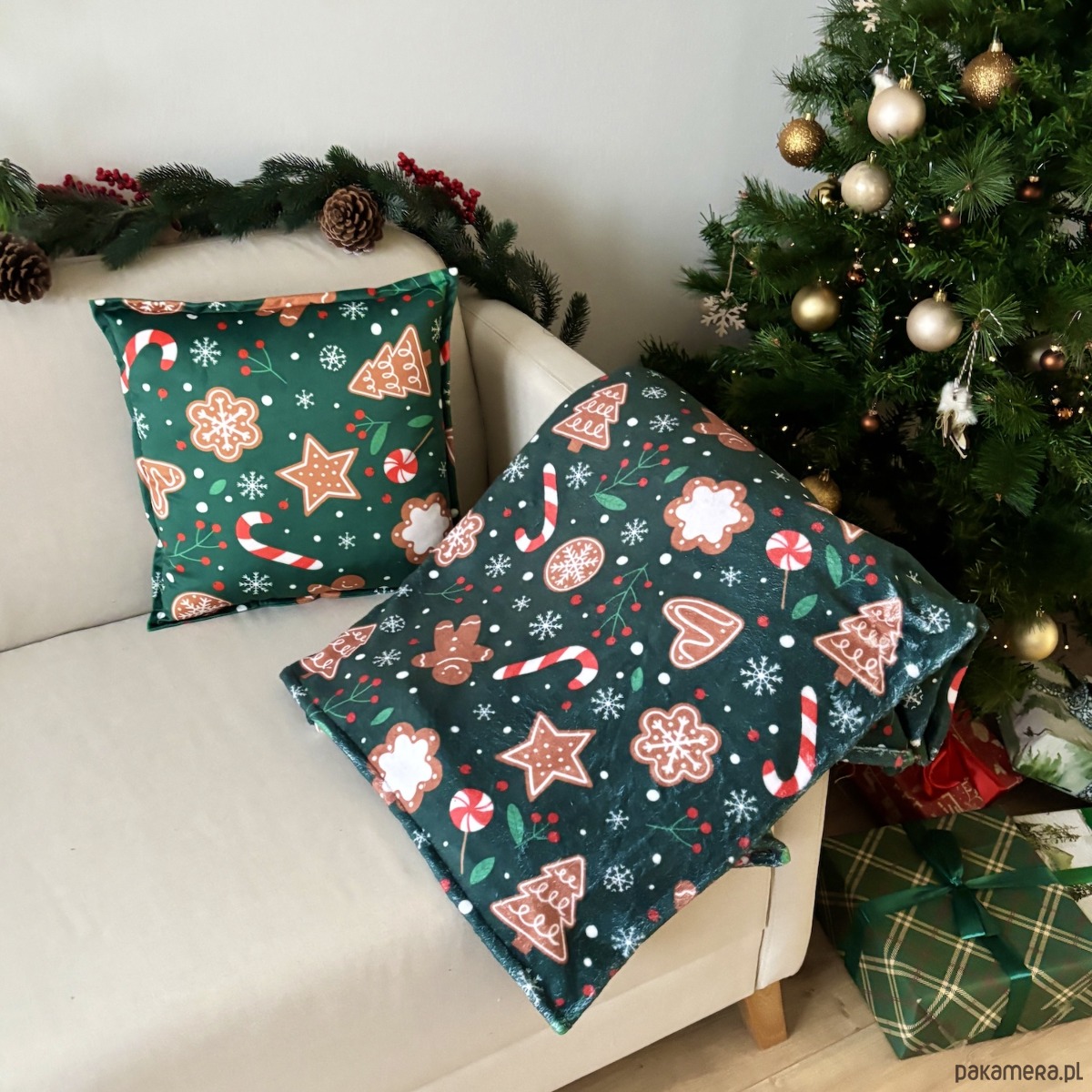 Miękki pluszowy koc z motywem świątecznych pierniczków na ciemnozielonym tle.