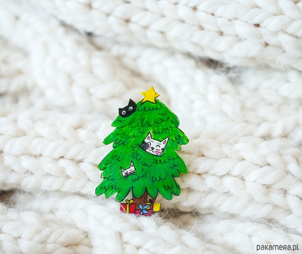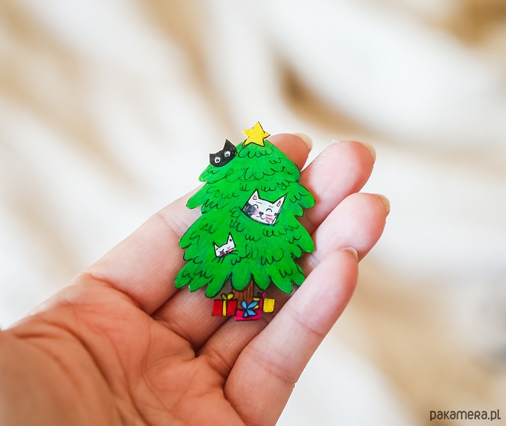 „Szukasz idealnego dodatku, który mówi kocham święta, ale moje koty kochają je bardziej? Oto broszka, która uchwyciła moment, zanim drzewko runęło. Złoto, blask i futrzany chaos w jednym!”