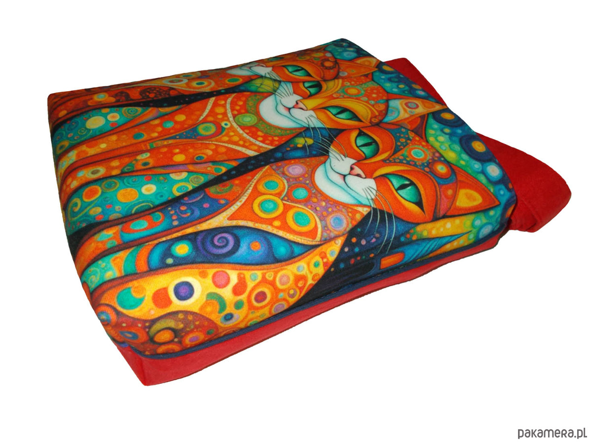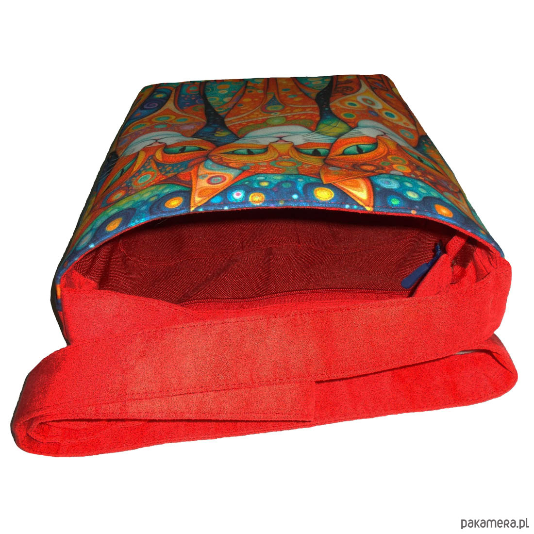 Autorska torba z usztywnionego eko zamszu, zapinana na zamek. Przód z weluru tapicerskiego. Pasek regulowany. Tył w kolorze paska (jasna czerwień). Torba trzyma fason. Wewnątrz dwie kieszenie - jedna na zamek, druga z miejscem na telefon i coś jeszcze. W szwach wypustka. Denko poszerzone. szerokość 32cm wysokość 30cm plus denko 8cm