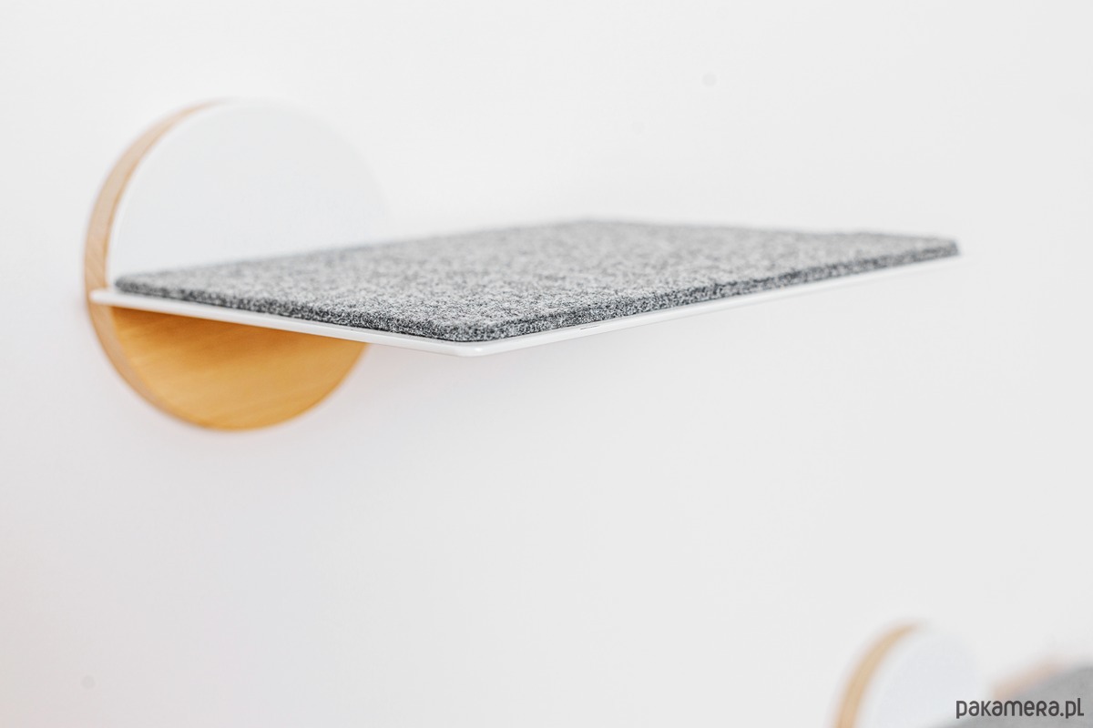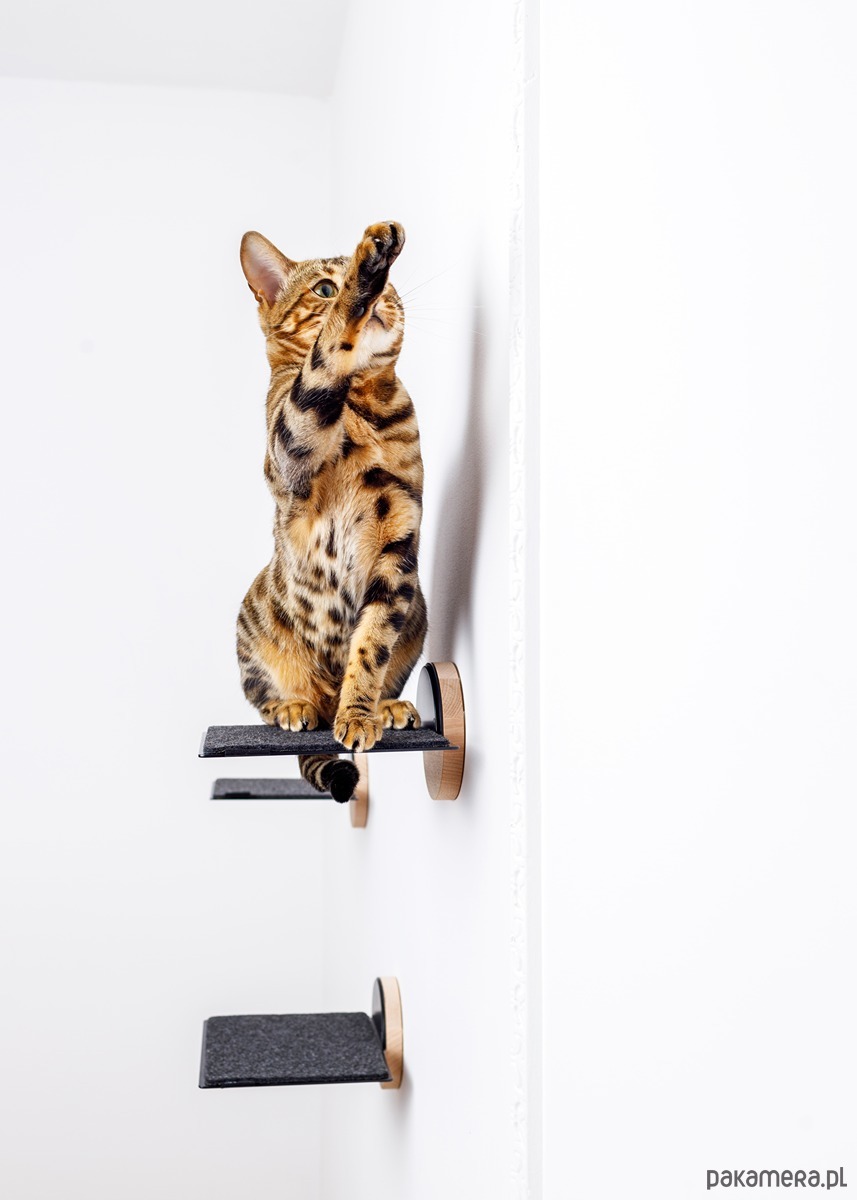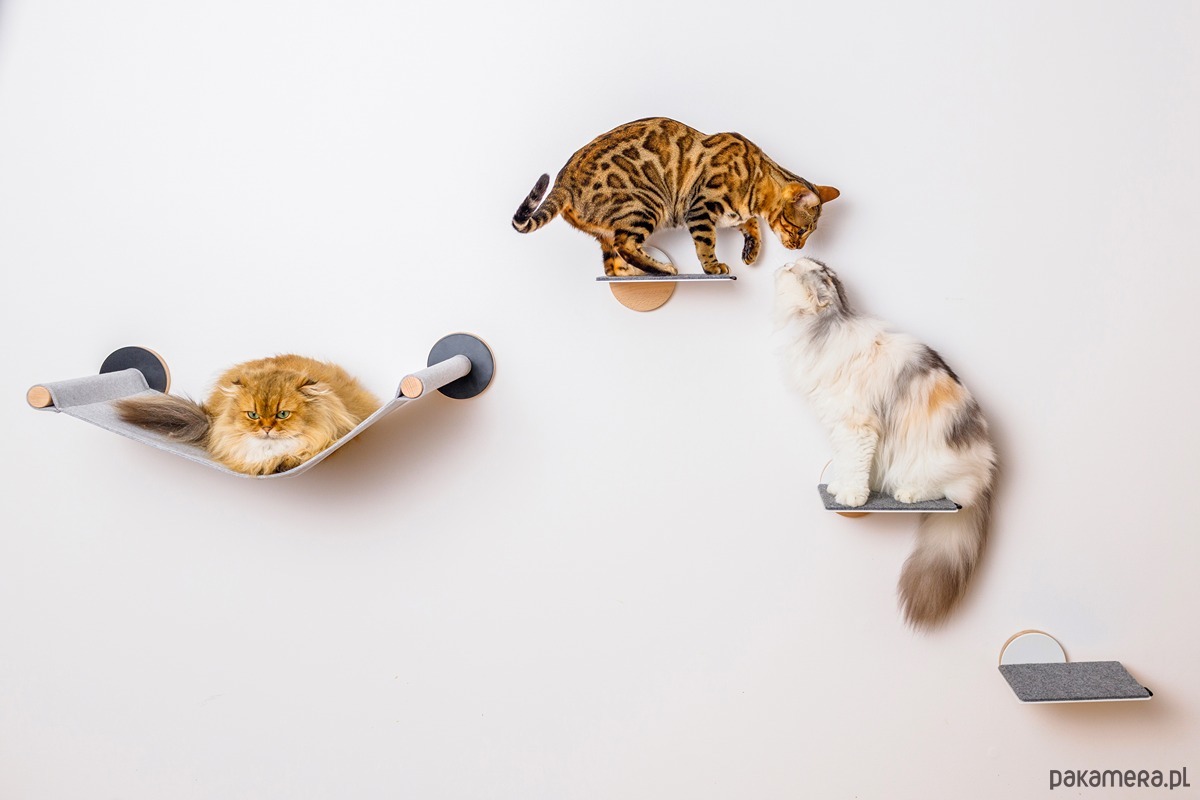 Półki umożliwiają kotu poruszanie się na różnych wysokościach i docieranie do wyżej położonych miejsc. Meble powstały w odpowiedzi na instynktowne zachowania kotów które wspinając się zaspokajają swoje potrzeby poznawcze.