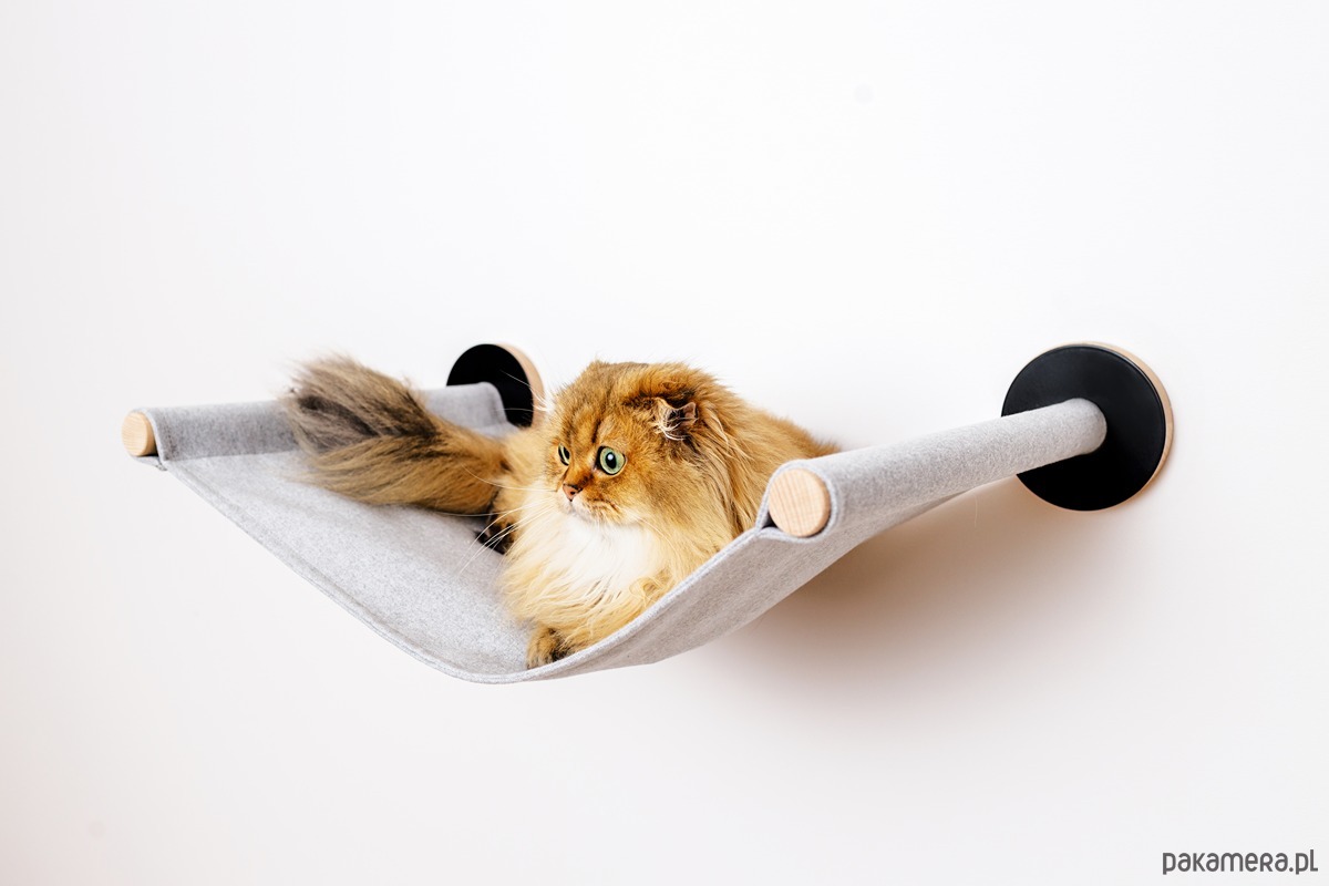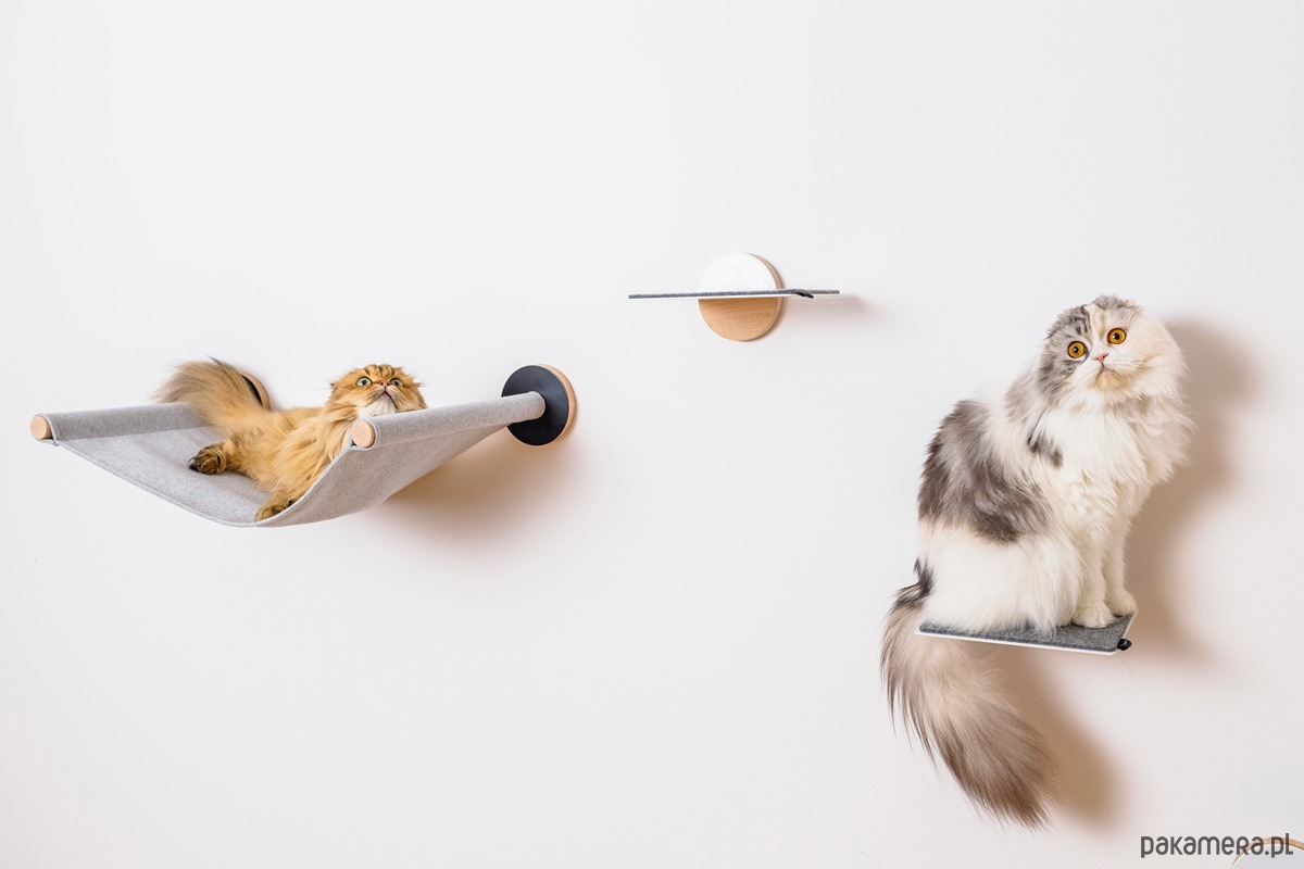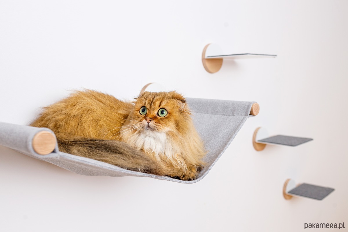 Utwórz ze schodków ściankę wspinaczkową w pobliżu ulubionych mebli Twojego kota lub tak by umożliwić mu dojście do strefy relaksu. Schodki komponują się z hamakiem dla kota little.forms.