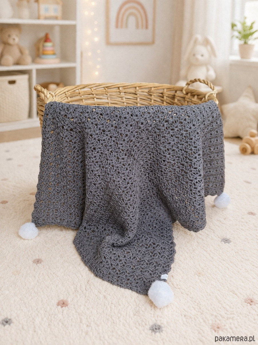 Kocyk Coco to wyjątkowy, ręcznie wykonany kocyk dziecięcy stworzony z myślą o komforcie i delikatności najmłodszych. Jego ażurowy splot sprawia, że jest lekki, miękki i przyjemny w dotyku, a ozdobne pompony nadają mu uroku i charakteru.