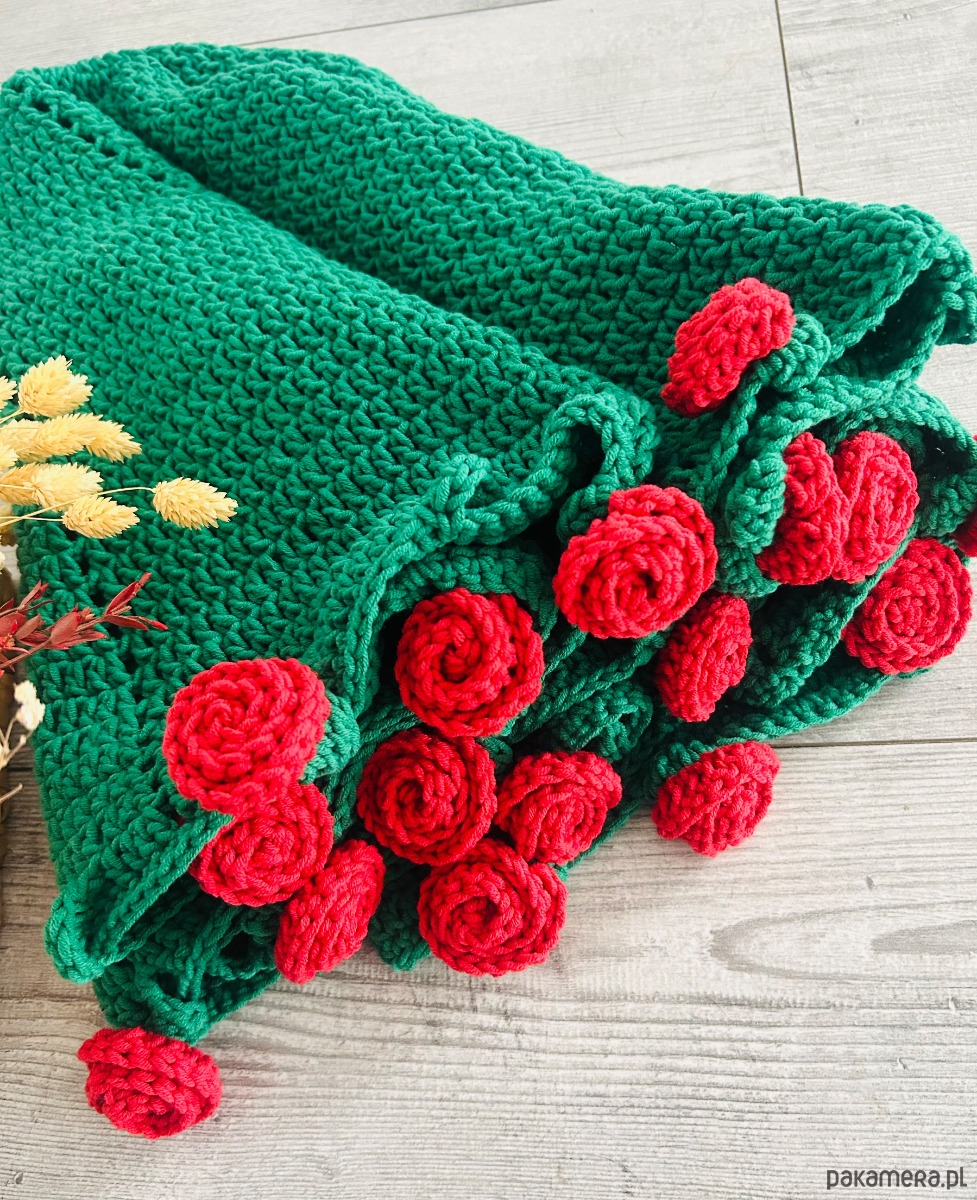 Kocyk w zielonym kolorze, róże w kolorze czerwonym.