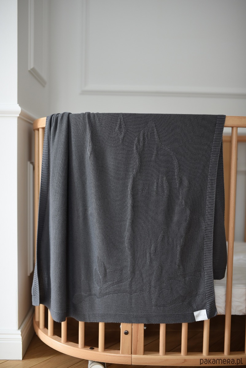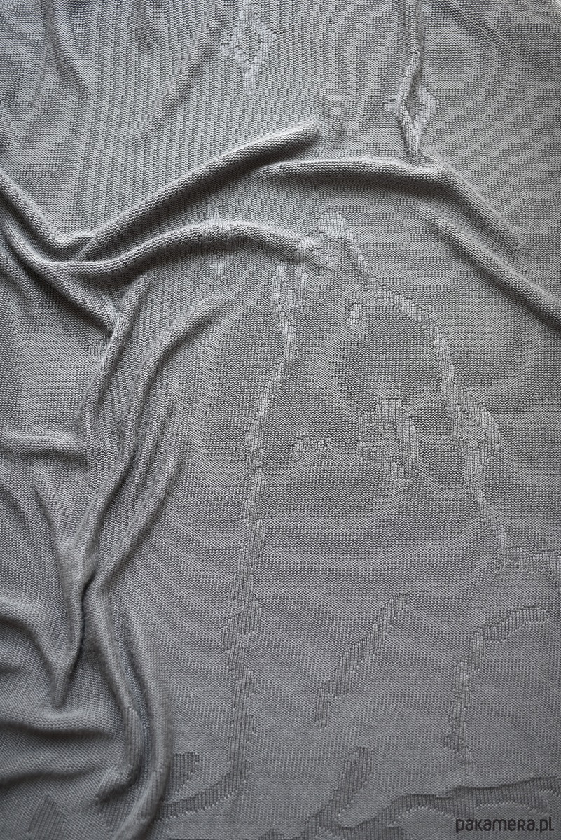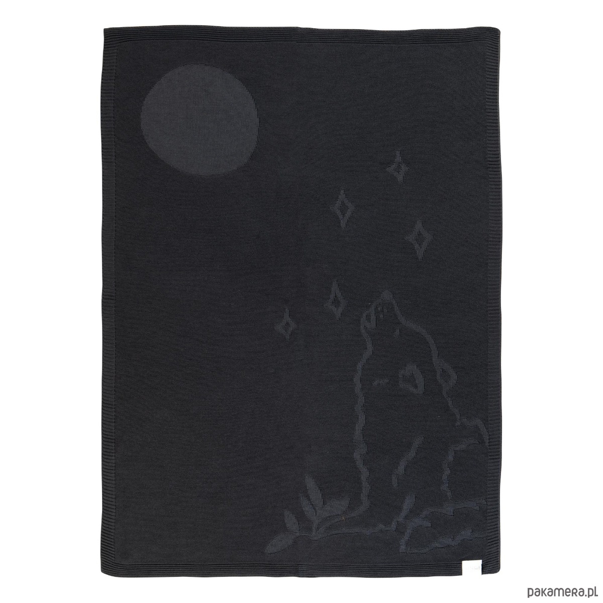 Wyjątkowy, autorski wzór widniejący na kocyku przedstawia wilka w blasku księżyca.