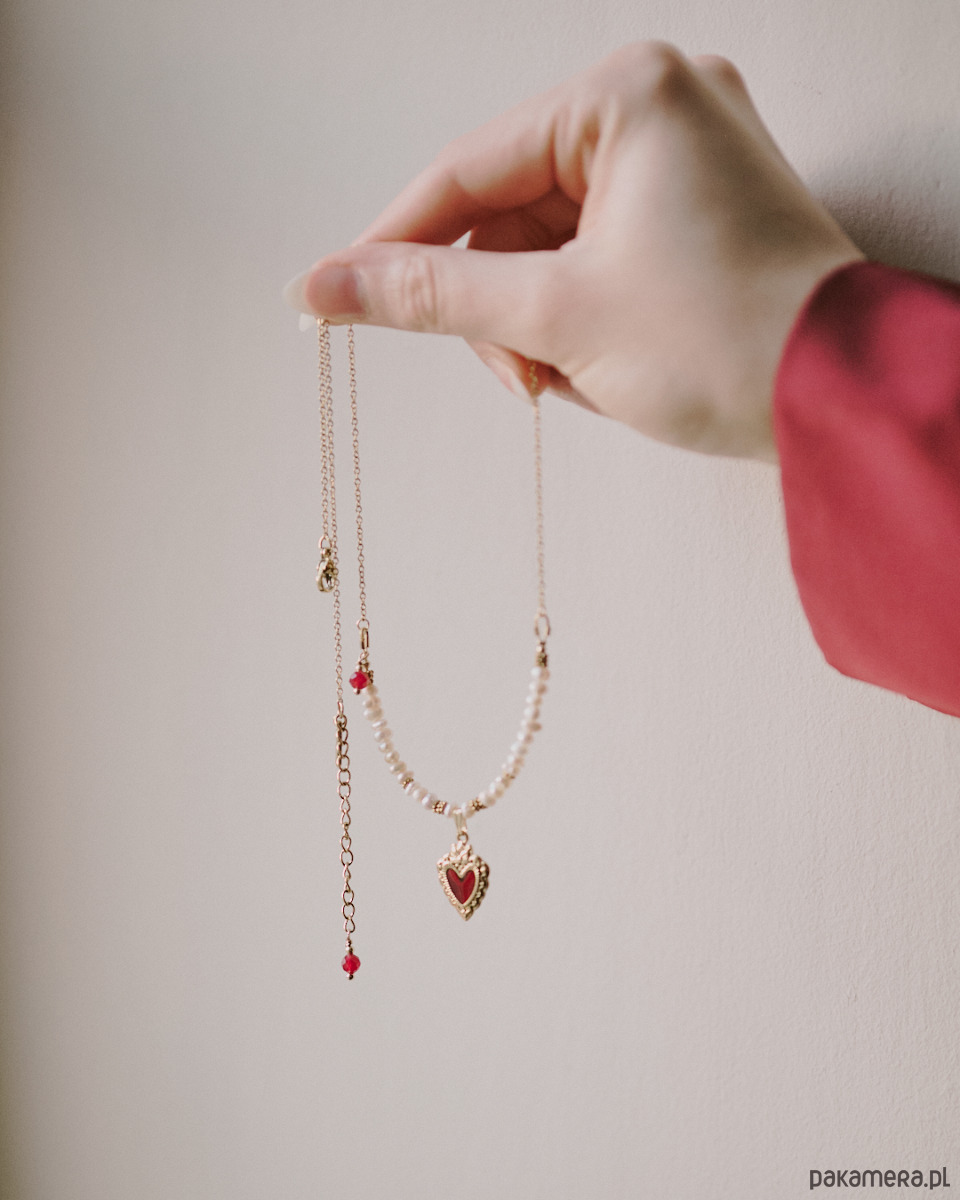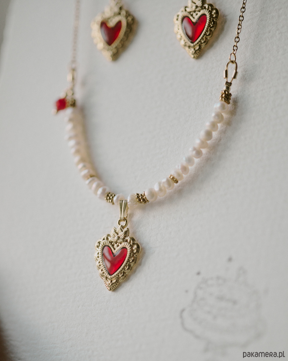 Kodali to walentynka w stylu małego rokoko. Obłe perełki, kuleczka jadeitu i ozdobne, laminowane serce. Zawieszone na delikatnym łańcuszku.