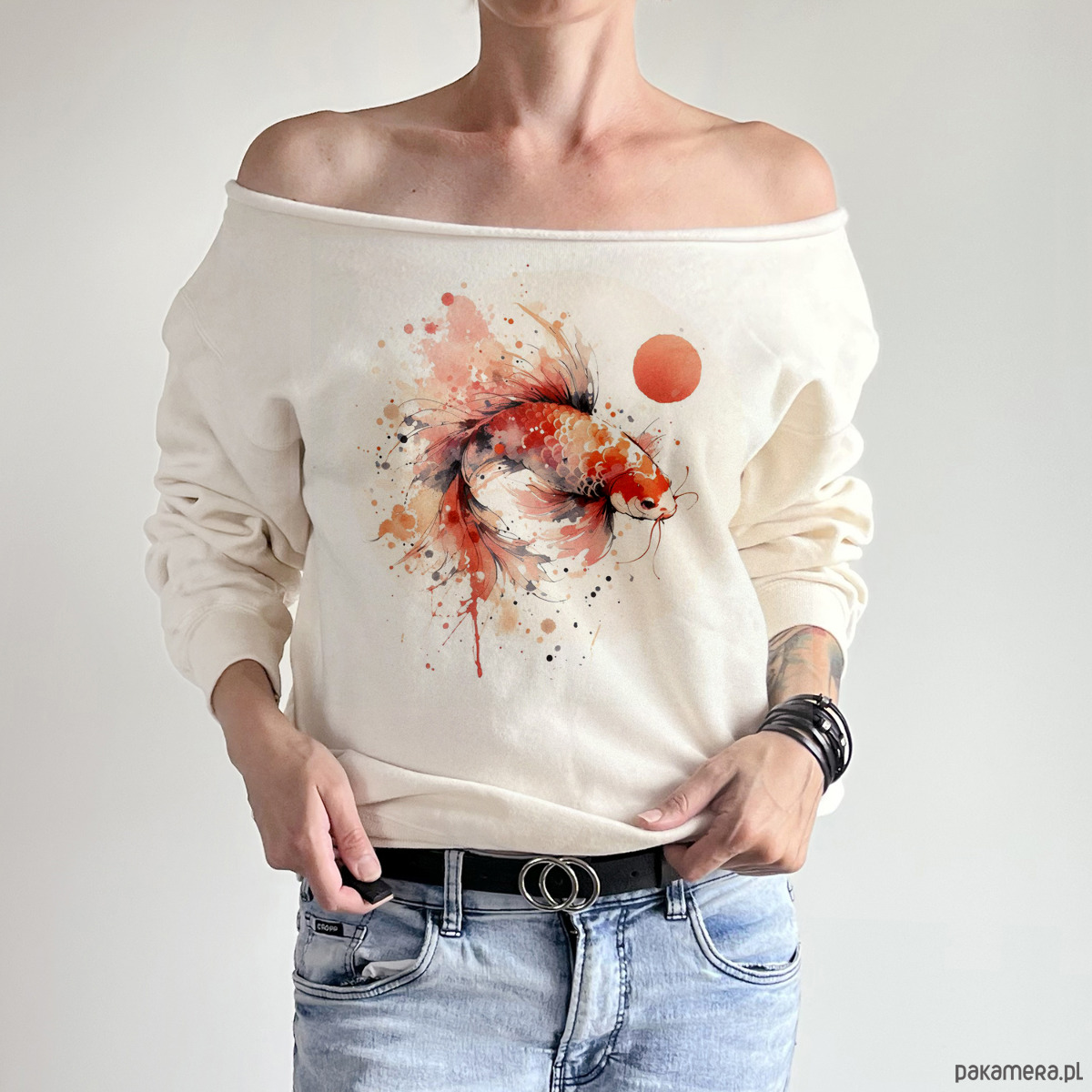 Akwarelowy karp koi w ciepłych odcieniach pomarańczy i czerwieni – delikatny, jak pędzel zanurzony w świetle.