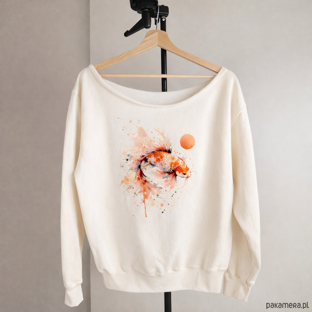 Akwarelowy karp koi w ciepłych odcieniach pomarańczy i czerwieni – delikatny, jak pędzel zanurzony w świetle.
