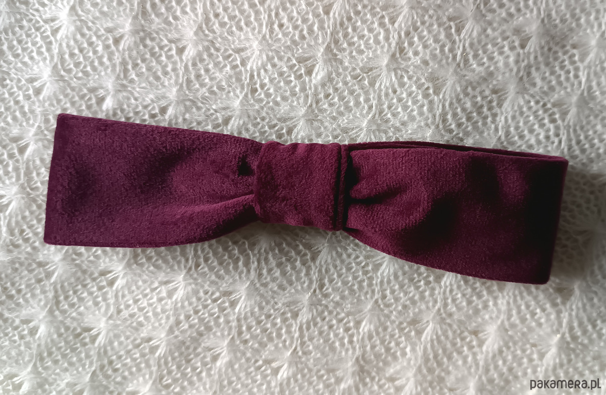 Dodaj swojej stylizacji odrobinę luksusu dzięki wyjątkowej kokardzie uszytej ze szlachetnego weluru w głębokim odcieniu burgundu.