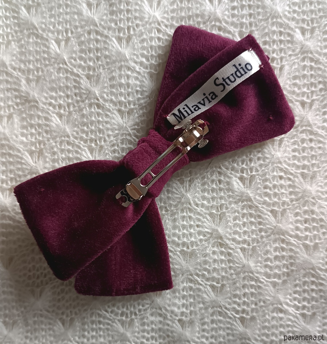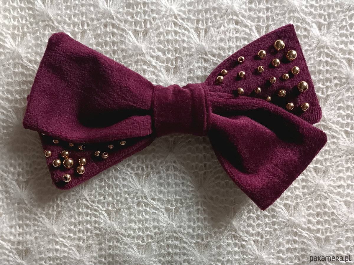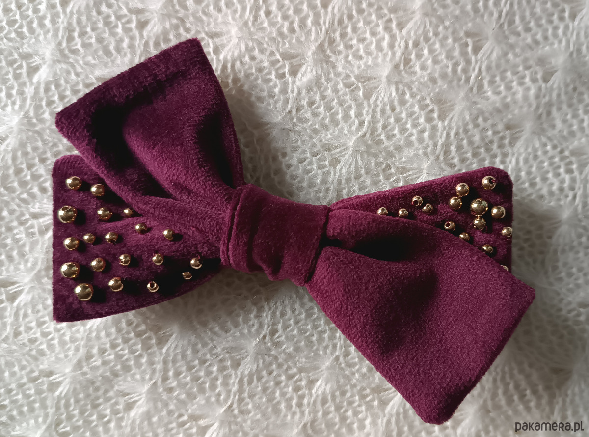 Dodaj swojej stylizacji odrobinę luksusu dzięki wyjątkowej kokardzie uszytej ze szlachetnego weluru w głębokim odcieniu burgundu.