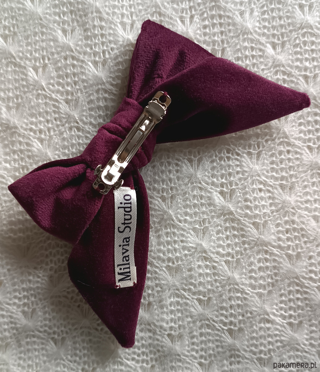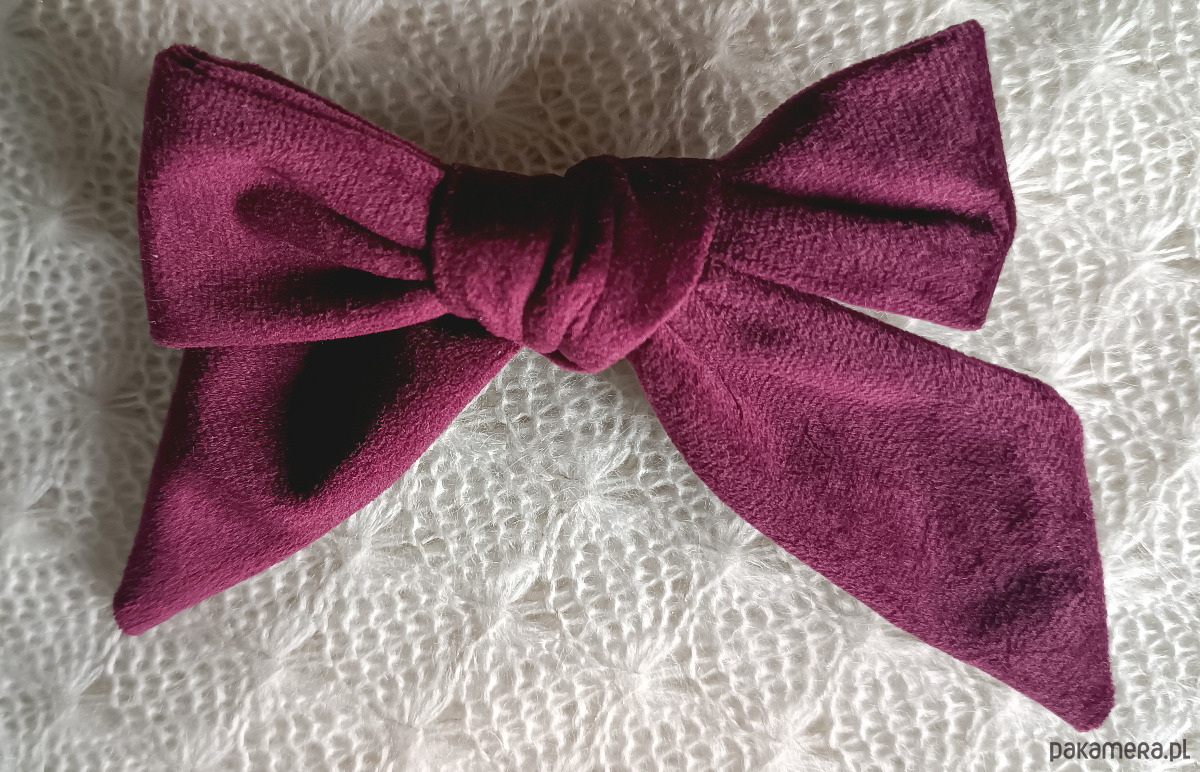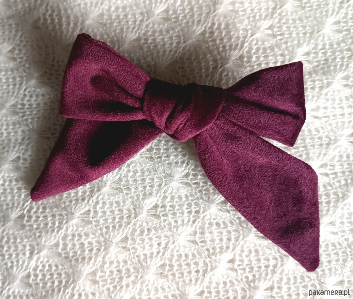 Dodaj swojej stylizacji odrobinę luksusu dzięki wyjątkowej kokardzie uszytej ze szlachetnego weluru w głębokim odcieniu burgundu.