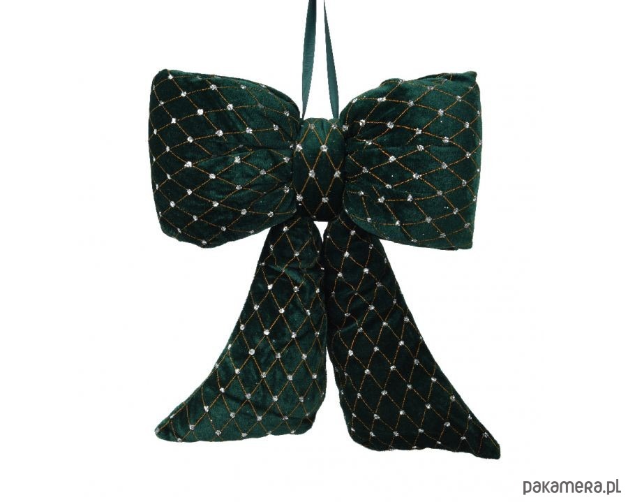 Dekoracyjna kokarda w kolorze głębokiej zieleni. Wykonana z poliestru. Jej trójwymiarowa struktura nadaje jej nowoczesny wygląd. Idealna do zawieszenia na choince, na ścianie czy jako ozdoba drzwi. Sprawdzi się w każdej aranżacji Można ją użyć również do udekorowania prezentów, tworząc piękne, świąteczne kompozycje. Będzie niezwykłą dekoracją nie tylko podczas świątecznego czasu.