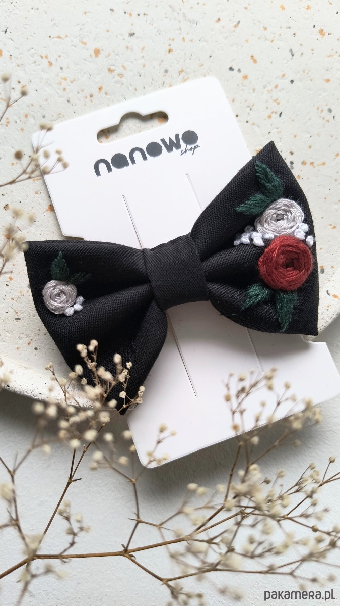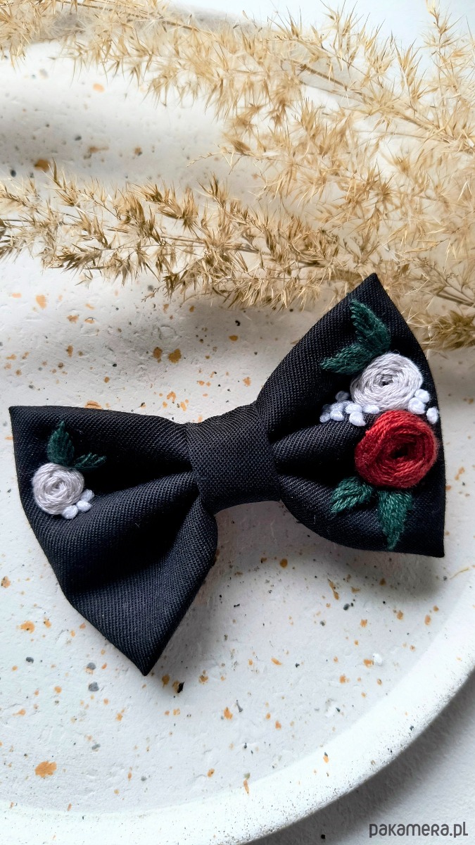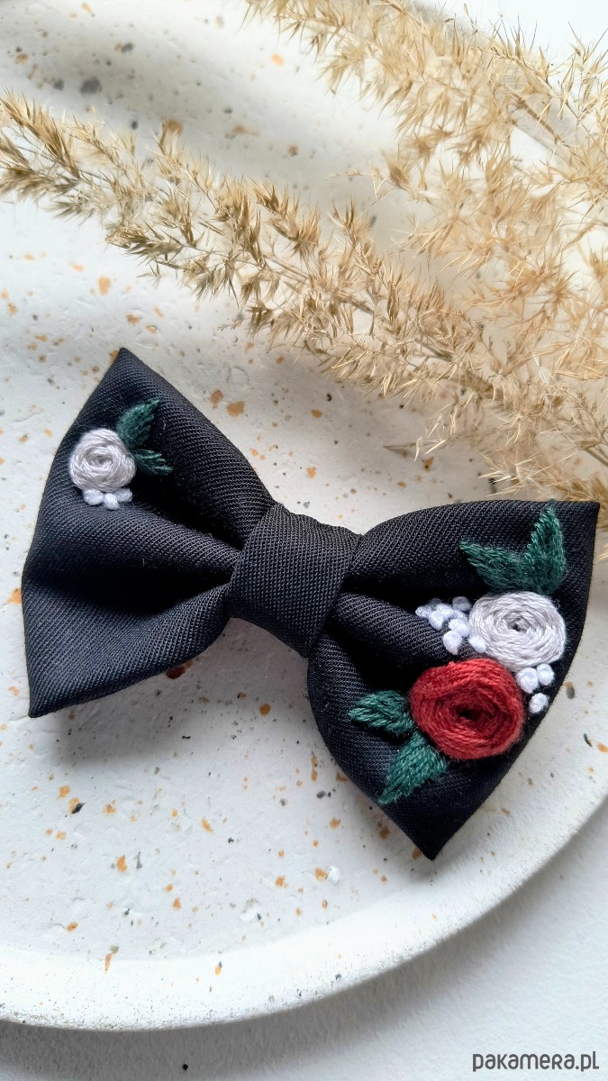 Haftowana kokarda do włosów doskonale sprawdzi się jako ozdoba do warkocza, kucyka czy rozpuszczonych włosów.