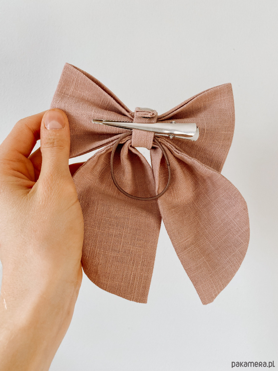 W zestawie z kokardką znajdują się spinka tukan oraz gumka do włosów.