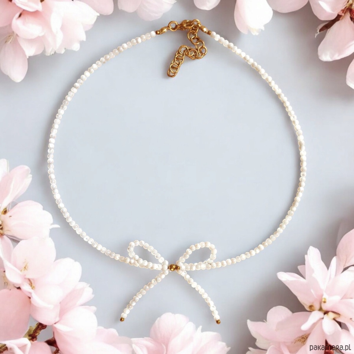 Kokardkowy choker wykonany z drobniutkich kuleczek białej muszli 2,5mm (miejscami opalizuje) - ciepła biel - oraz przekładek ze złotego hematytu.