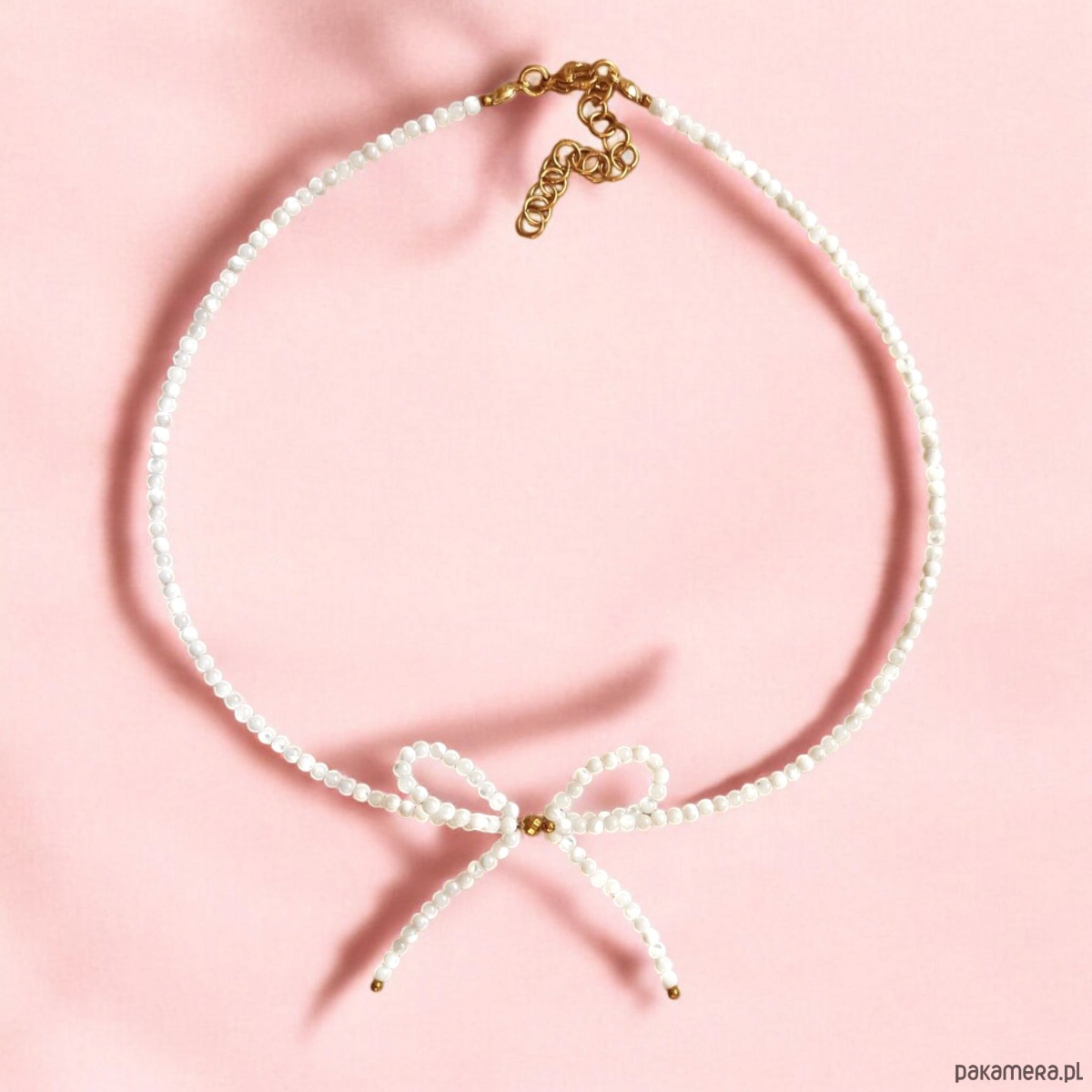 Kokardkowy choker wykonany z drobniutkich kuleczek białej muszli 2,5mm (miejscami opalizuje) - ciepła biel - oraz przekładek ze złotego hematytu.