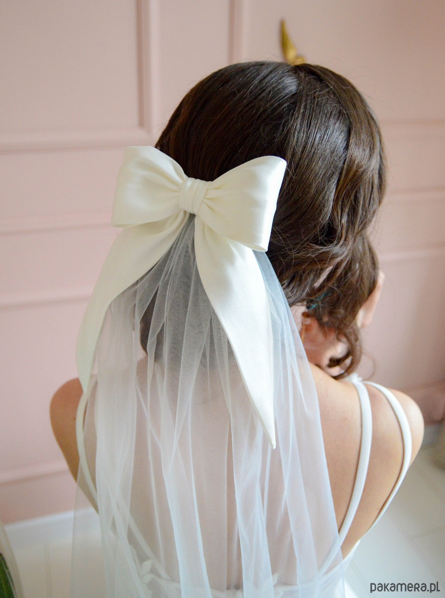 Kokarda wykonana z ślubnego materiału mikado w kolorze ecru. Pięknie się układa, materiał o prążkowanej fakturze. Idealna na ślub lub wieczór panieński. Zapięciem jest metalowy klips typu krokodylek, na życzenie wykonujemy mocowanie typu metalowy grzebyk. Będzie pięknie prezentować się zarówno na włosach upiętych jak i rozpuszczonych, także jako uzupełnienie welonu.