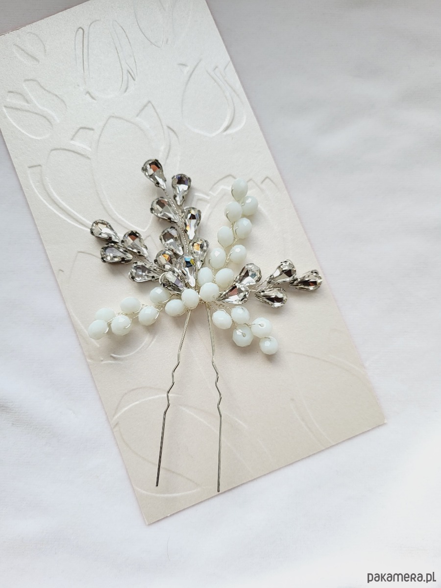 Ozdoba do włosów wypleciona na elastycznym druciku. Koraliki w kolorze bialym oraz oprawione kryształki Preciosa w kolorze clear.