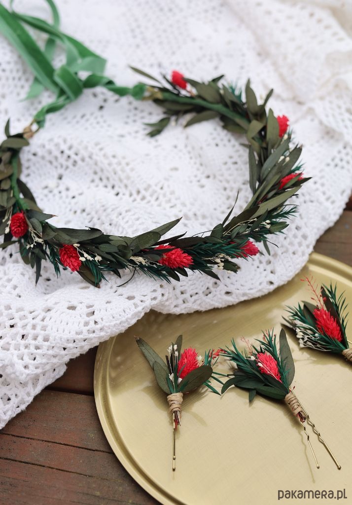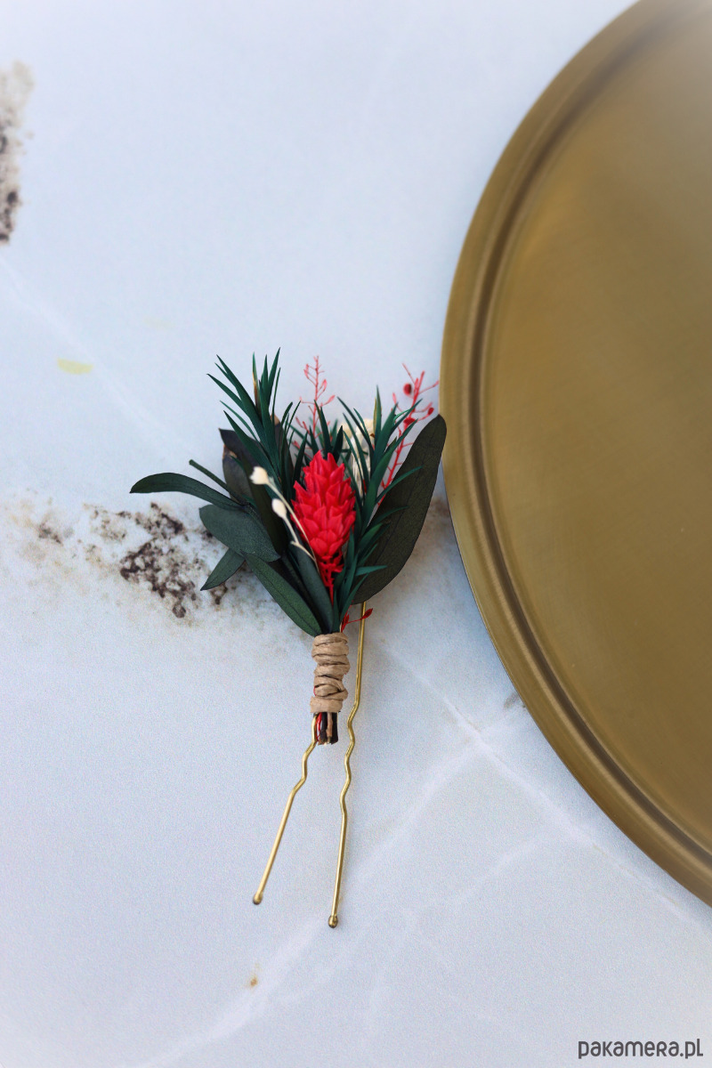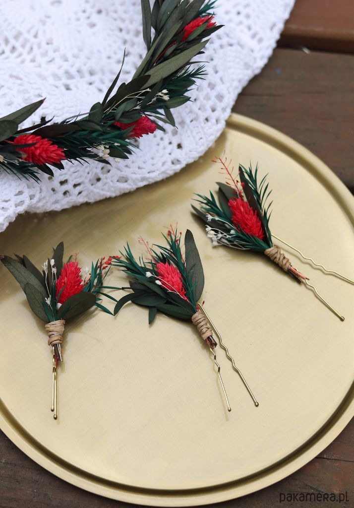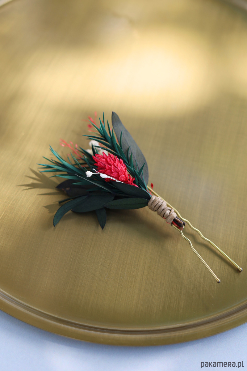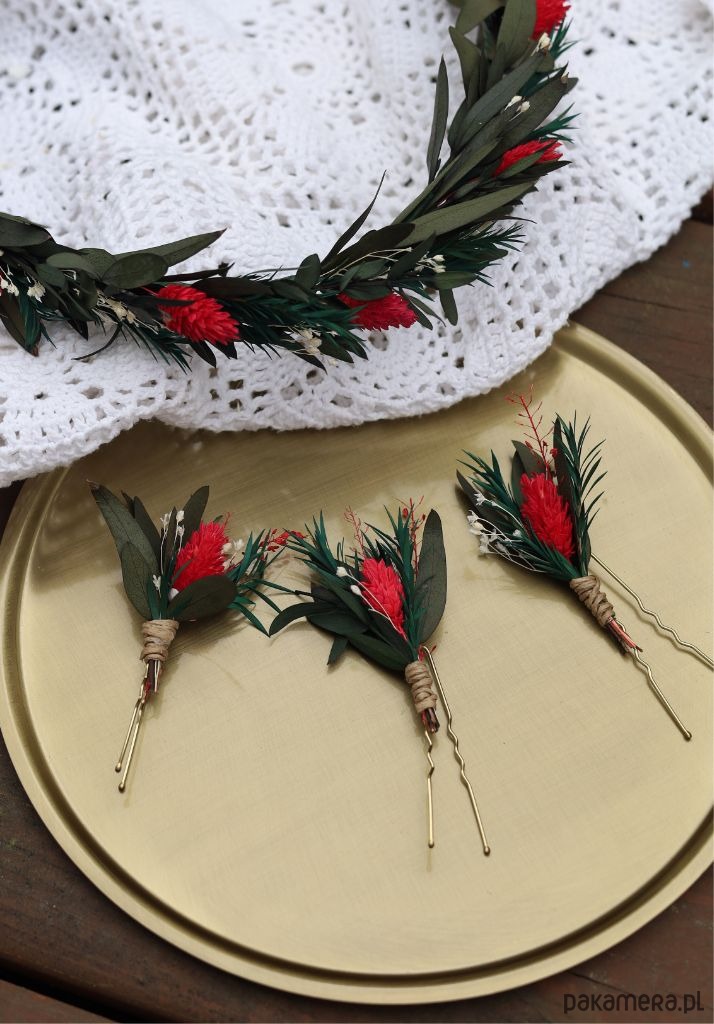 Każda kokówka składa się z wsuwki do włosów, na której umieszczony jest mini bukiet z suszonych i stabilizowanych kwiatów, w odcieniach zieleni z dodatkiem bieli i czerwieni. Dzięki swojej uniwersalności, kokówki mogą być używane jako samodzielna ozdoba, lub stanowić uzupełnienie do wianka czy grzebyka, tworząc spójną i elegancką stylizację ślubną.
