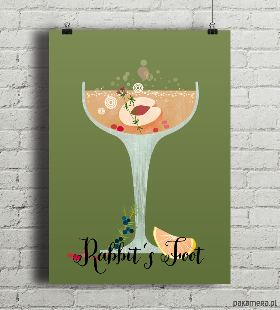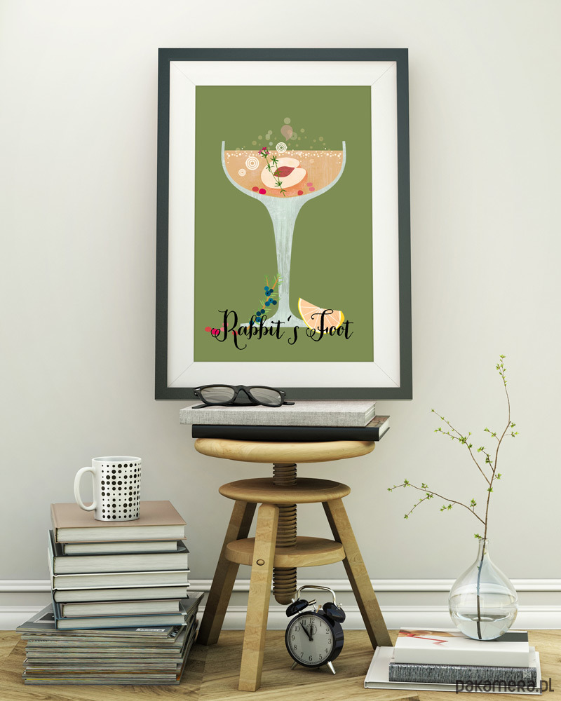 Plakat w stylu skandynawskim z autorską grafiką przedstawiającą przedstawiającą kieliszek z koktajlem Rabbit's Foot. Oryginalna dekoracja do wymarzonego salonu bądź kuchni. Zaprojektowany przez niemiecką artystkę Elisandrę Sevenstar.