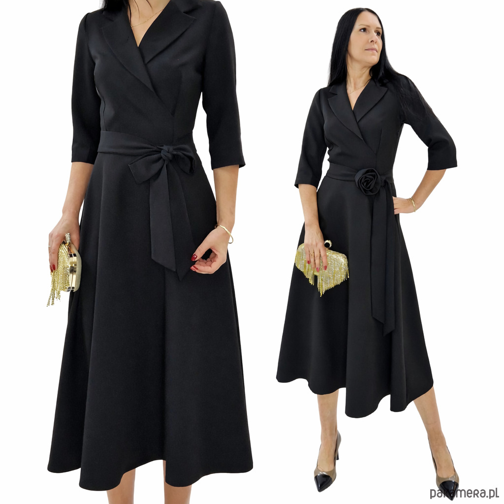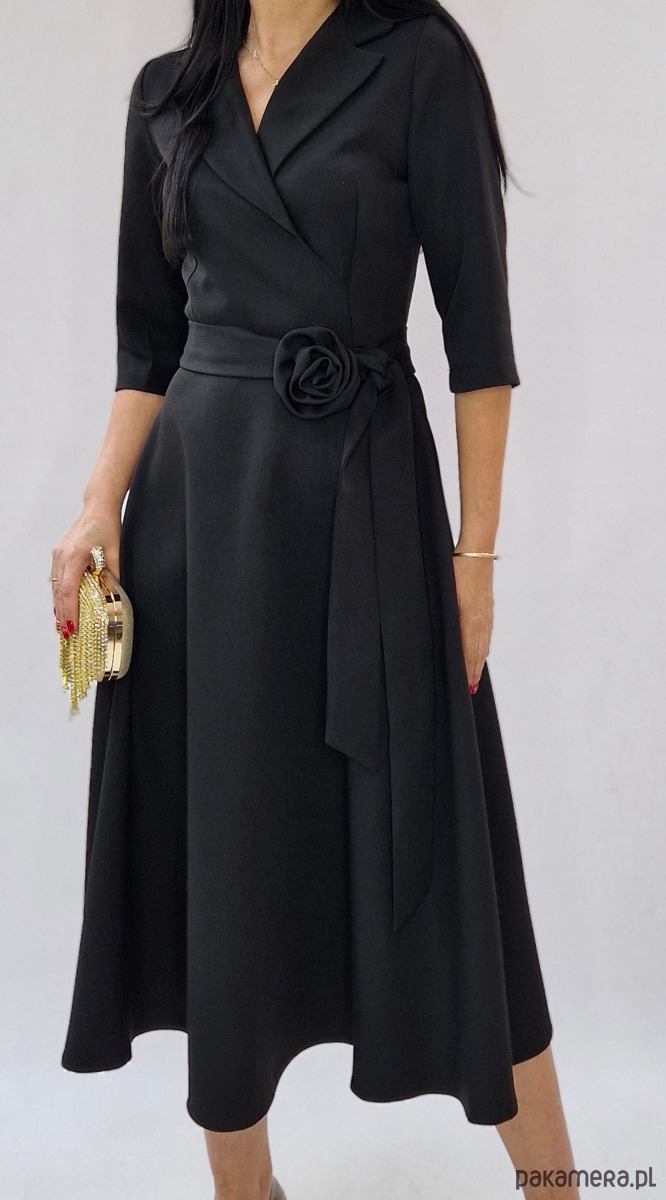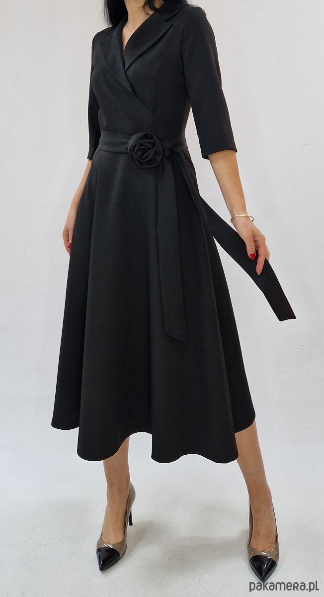 Elegancka sukienka midi . Klasyczny fason i rozkloszowany dół nadają jej kobiecego charakteru, a ozdobny pasek z kwiatem pięknie podkreśla talię. Sukienka dostępna jest w rozmiarach od 34 do 54.
