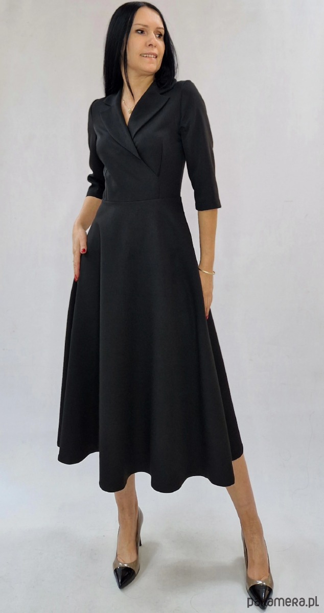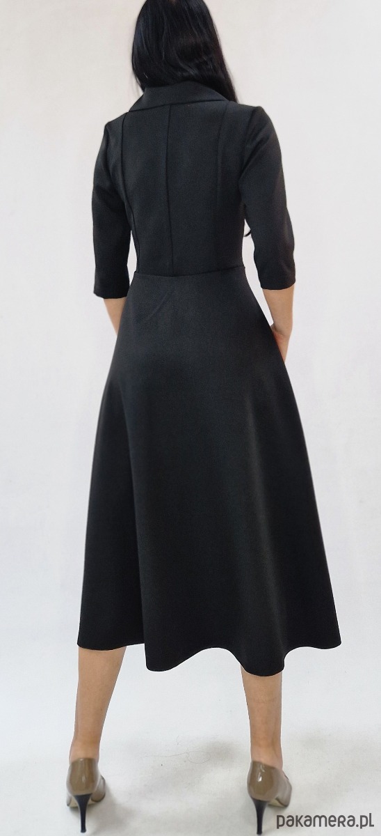 Koktajlowa elegancka sukienka midi z kołnierzem - Czarna