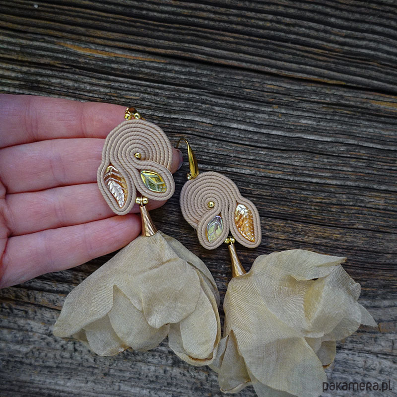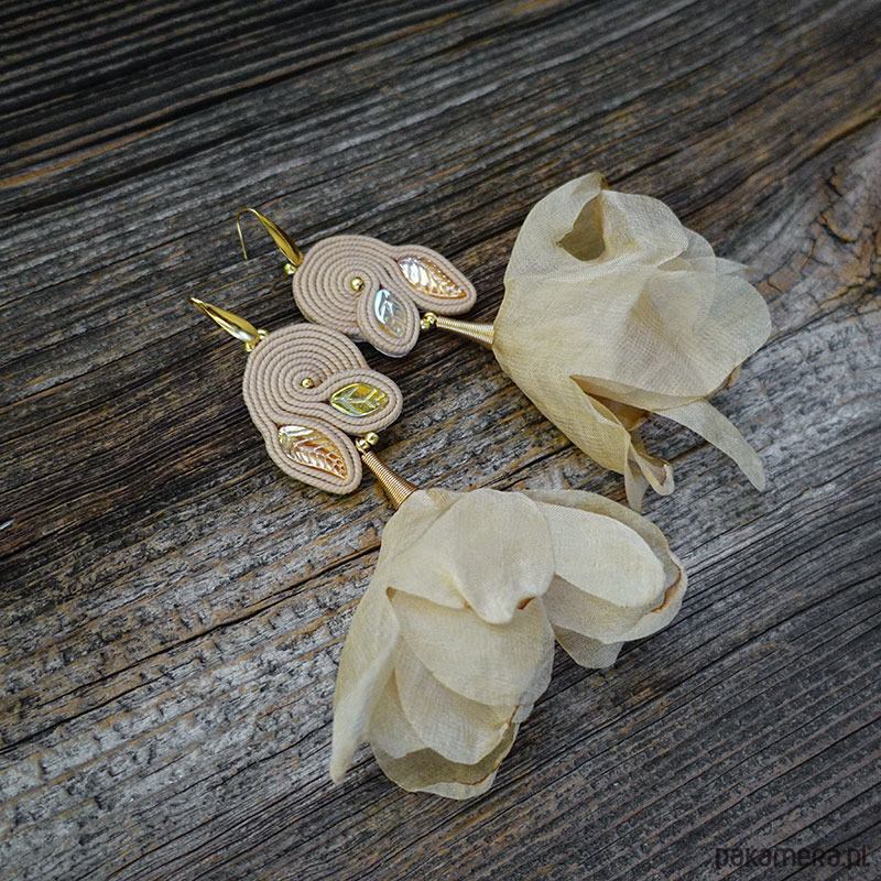 materiały: sznurki sutasz, szklane listki, koraliki Toho, ozdobne szyfonowe kwiaty, bigle otwarte ze stali chirurgicznej w kolorze złotym;