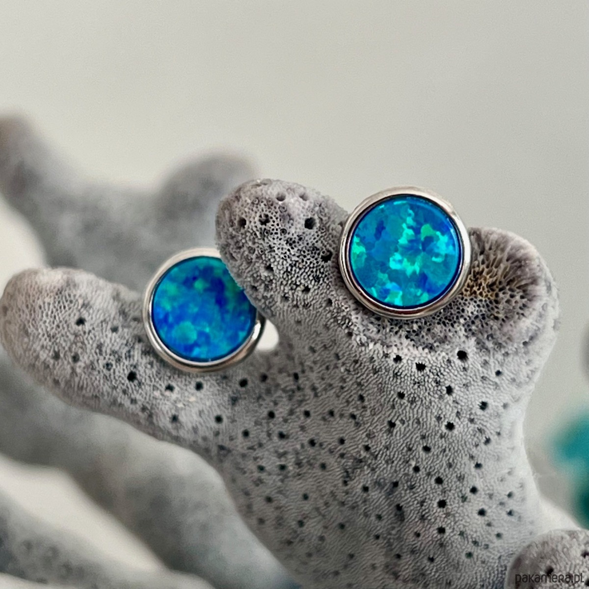 Kolczyki w kształcie kół zachwycają błękitnym opalem rekonstruowanym, który mieni się w środku niczym spokojna tafla morza. Srebrny obrys ze srebra próby 925 subtelnie podkreśla kamień, dodając całości klasy i szlachetności.