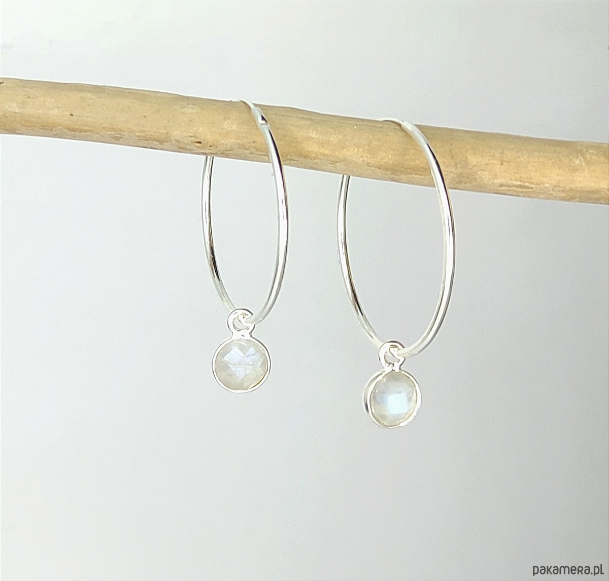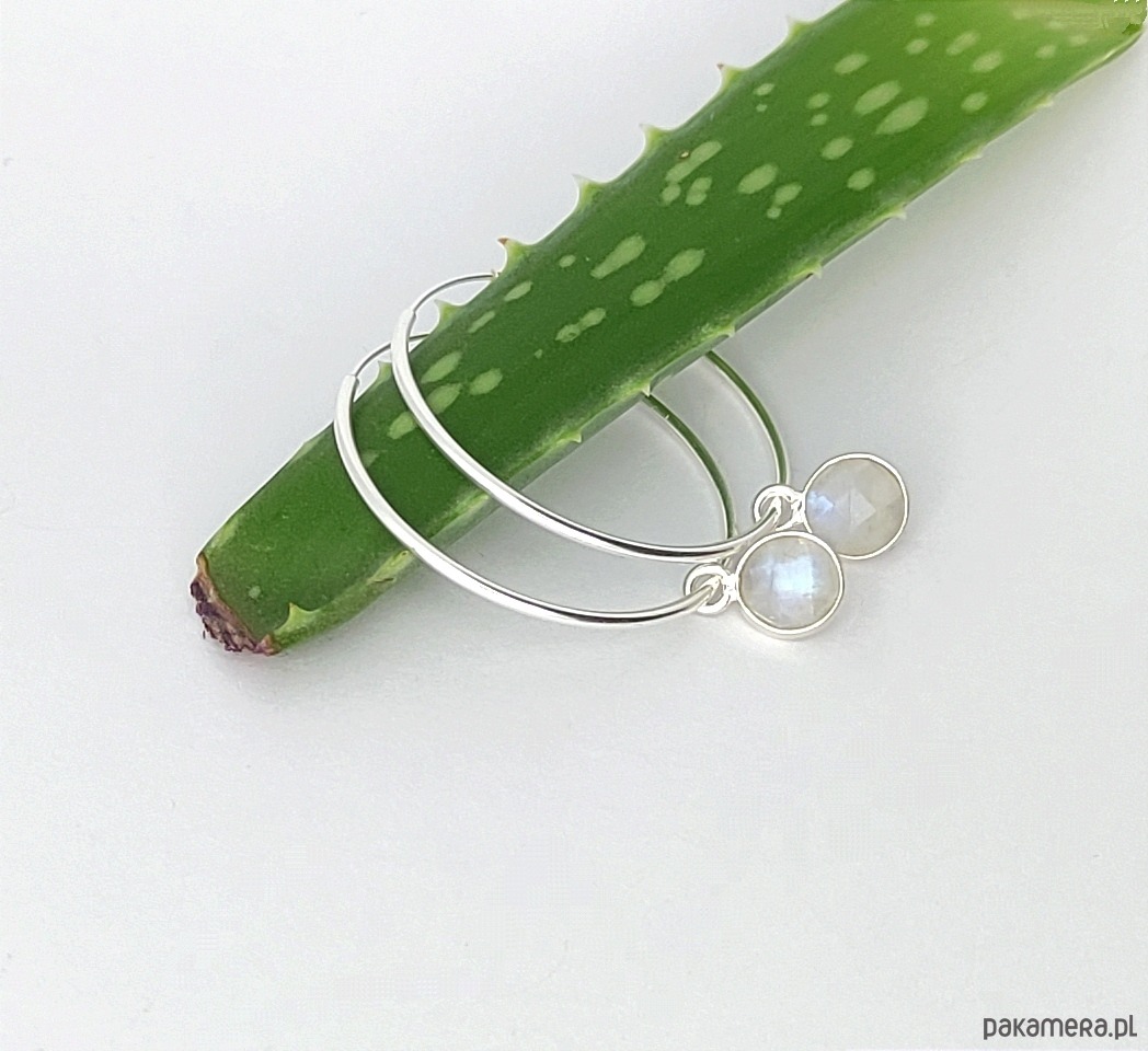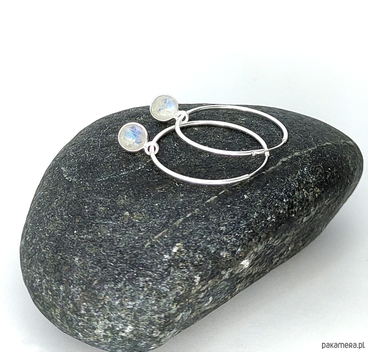 Klasyczne koła, bardzo kobiece i zawsze modne. Z dodatkiem Twojego ulubionego kamienia będą ciekawą i efektowną ozdobą. W tym modelu pięknie połyskują kamienie księżycowe - w zależności od światła widać różne odcienie błękitnej poświaty. Dwa w jednym, gdyż możesz nosić same koła, a w zależności od nastroju użyć również ślicznej zawieszki. Całość w srebrze 925.
