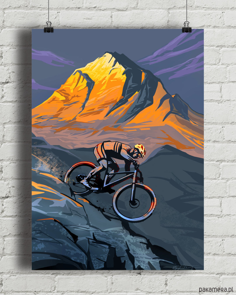 Góry i rower to idealne połączenie. Nasz plakat wybiera na swój temat najbardziej spektakularny moment rowerowej wyprawy. Na pierwszym planie rowerzysta zmaga się z technicznym zjazdem, w tle ostatnie promienie zachodzącego słońca oświetlają skalisty szczyt. Autorem grafiki jest kanadyjski artysta Sassan Filsoof.
