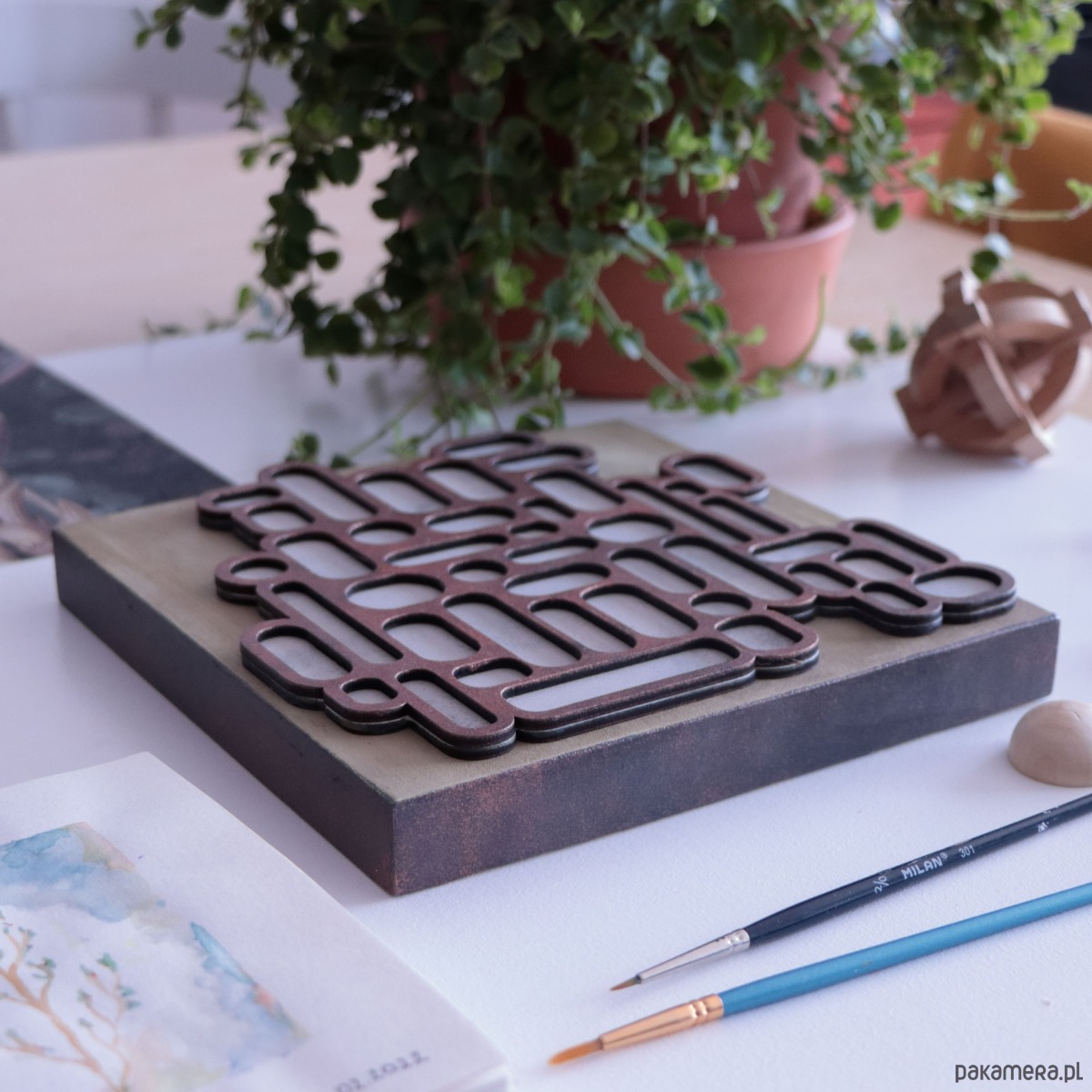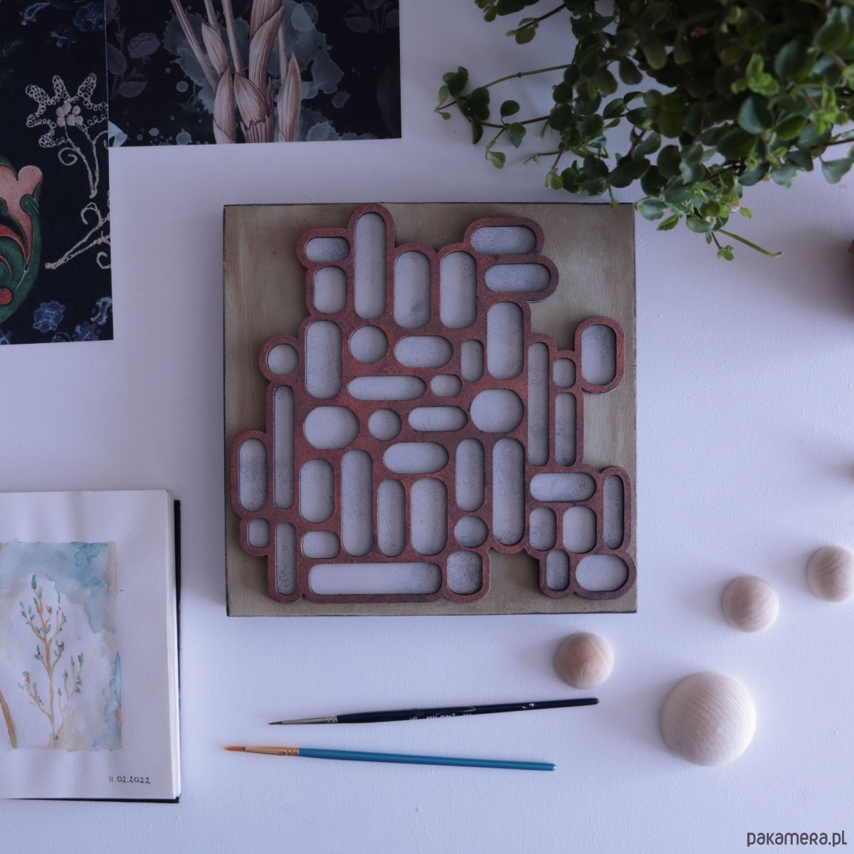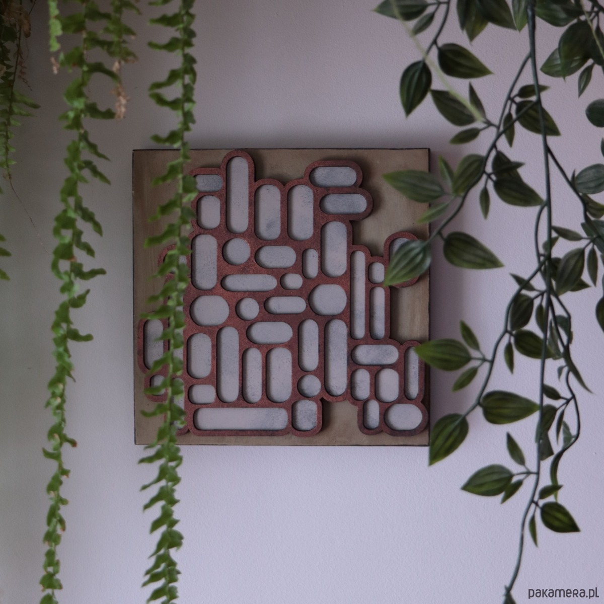 Drewniany obrazek 3D o wymiarach 20x20 cm.