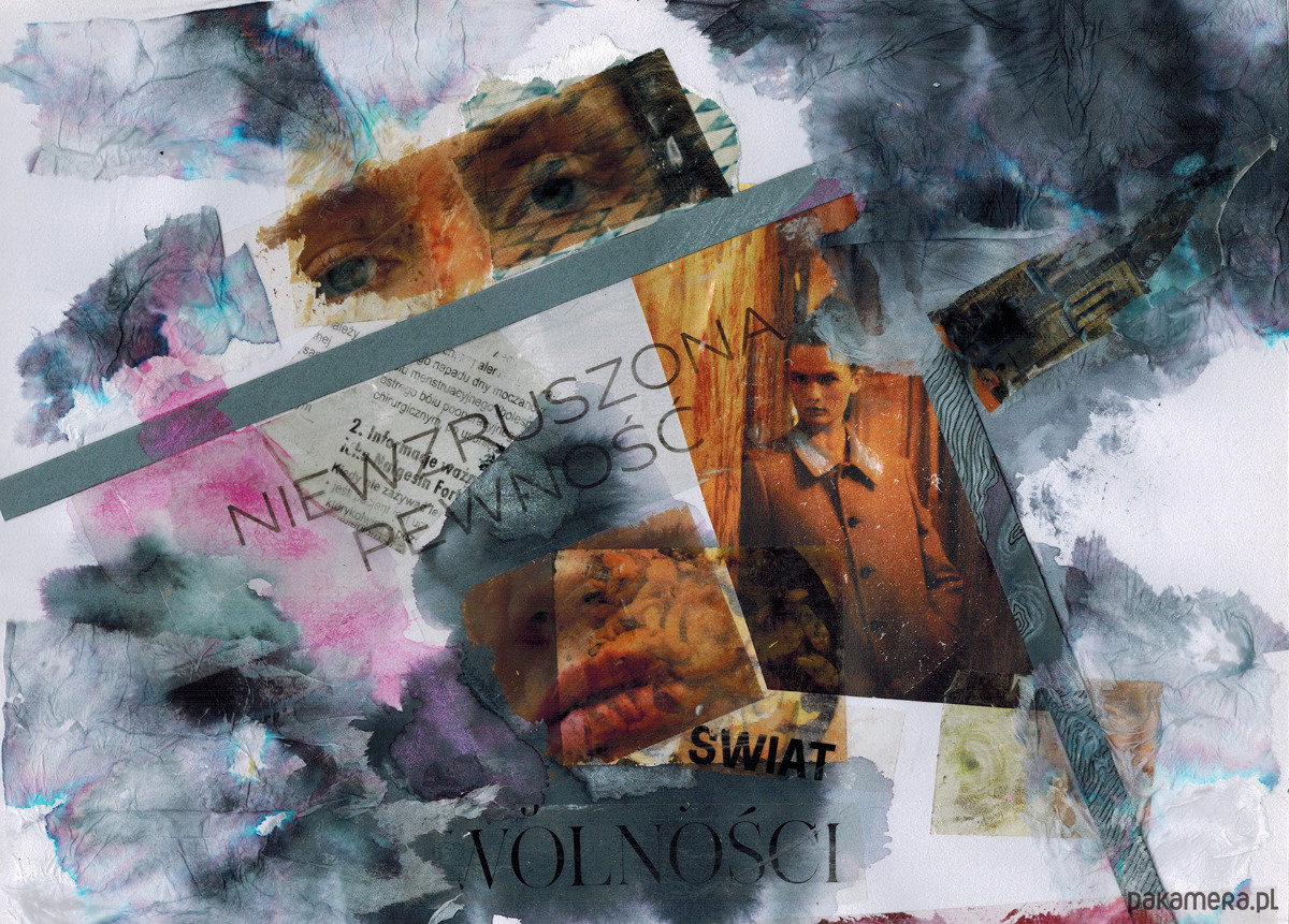 Kolaż "Niewzruszona pewność" z cyklu "Momenty" to zapis emocji. Czy pewność, której od nas wymaga swiat zawsze jest niewzruszona? Nawet jeśli tak właśnie się nam wydaje?.