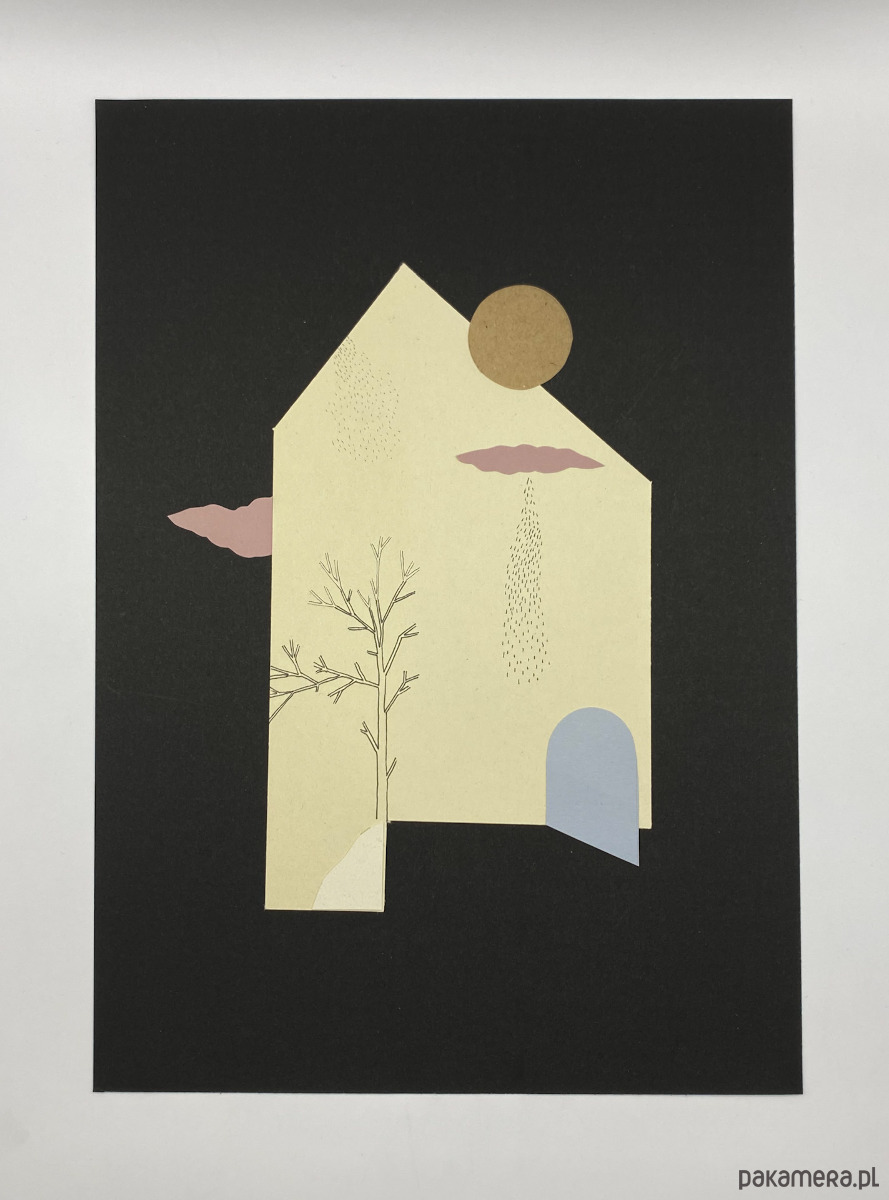 Kolaż analogowy, wykonany na papierze o wysokiej gramaturze z papierowych wycinanek, połączony z delikatnym rysunkiem.