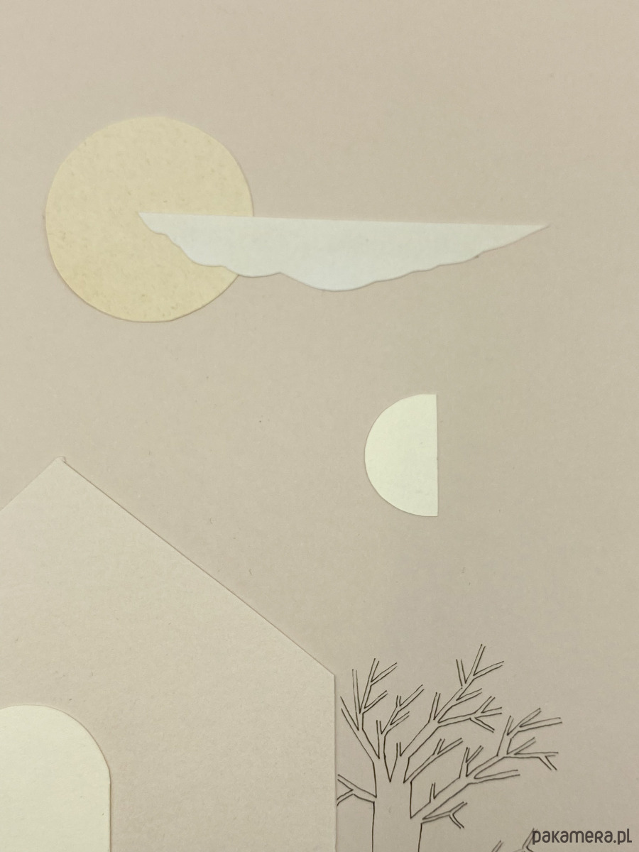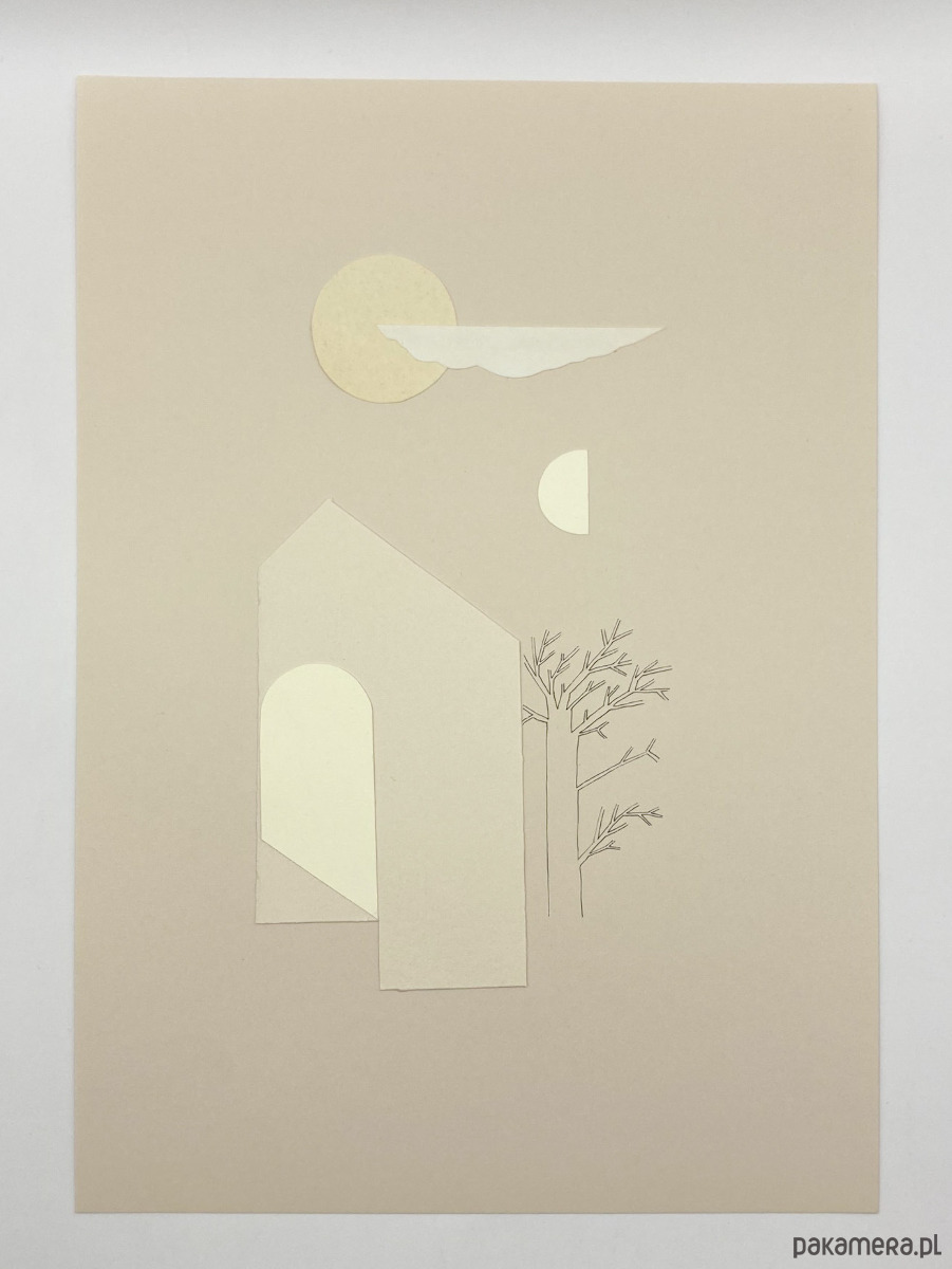 Kolaż analogowy, wykonany na papierze o wysokiej gramaturze z papierowych wycinanek, połączony z delikatnym rysunkiem.