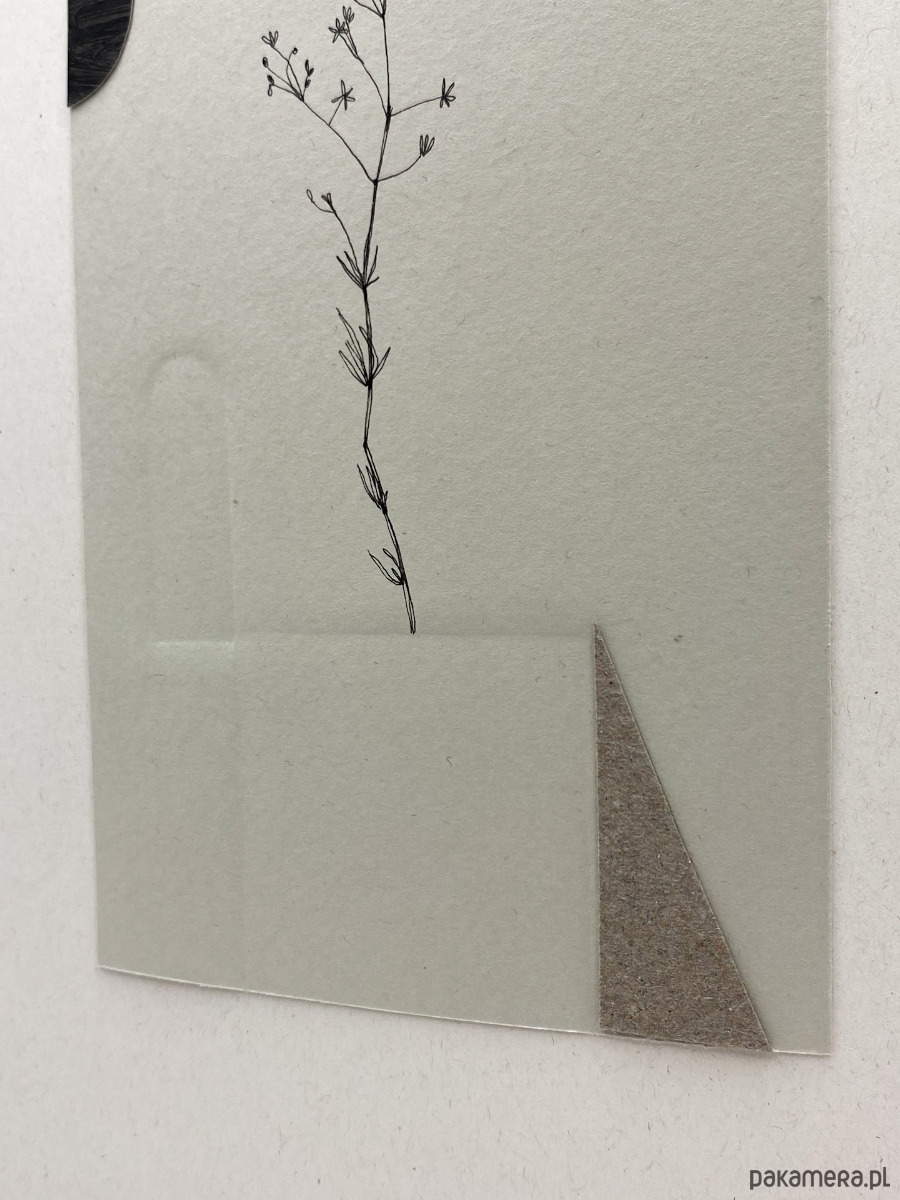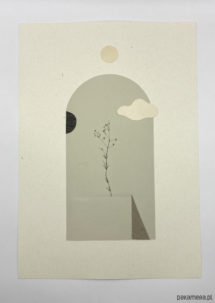 Kolaż analogowy, wykonany na papierze o wysokiej gramaturze z papierowych wycinanek, połączony z delikatnym rysunkiem.